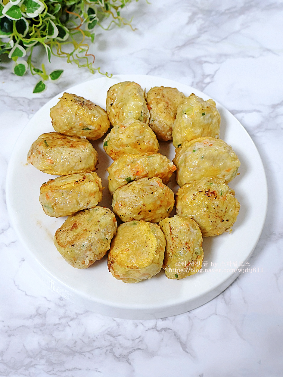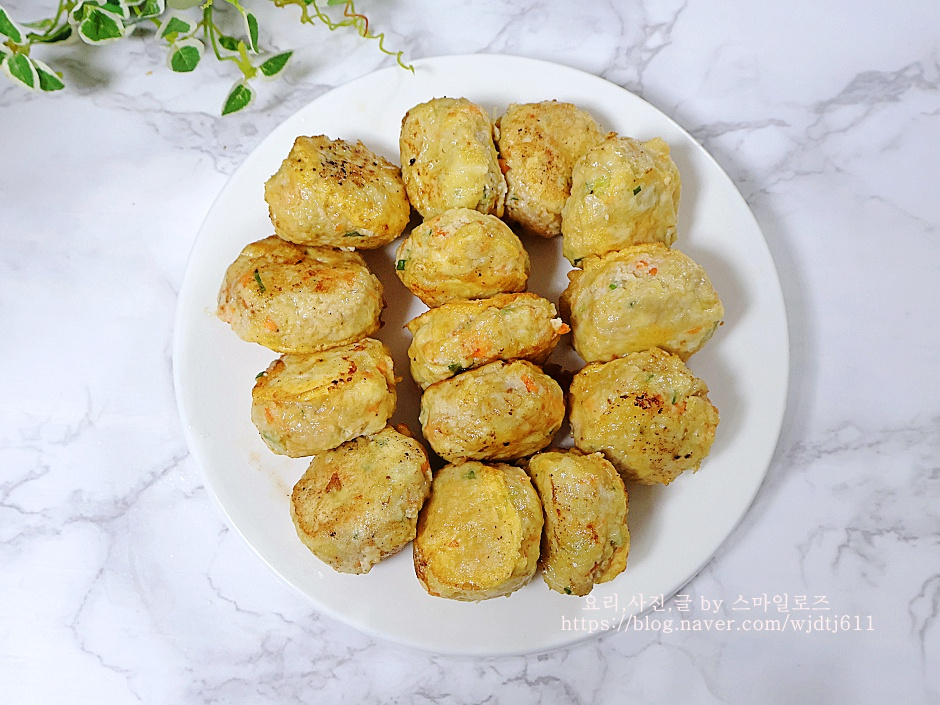 두부와 야채도 잘게 다져서 동그랗게 만들어 밀가루와 계란물을 입힌 후