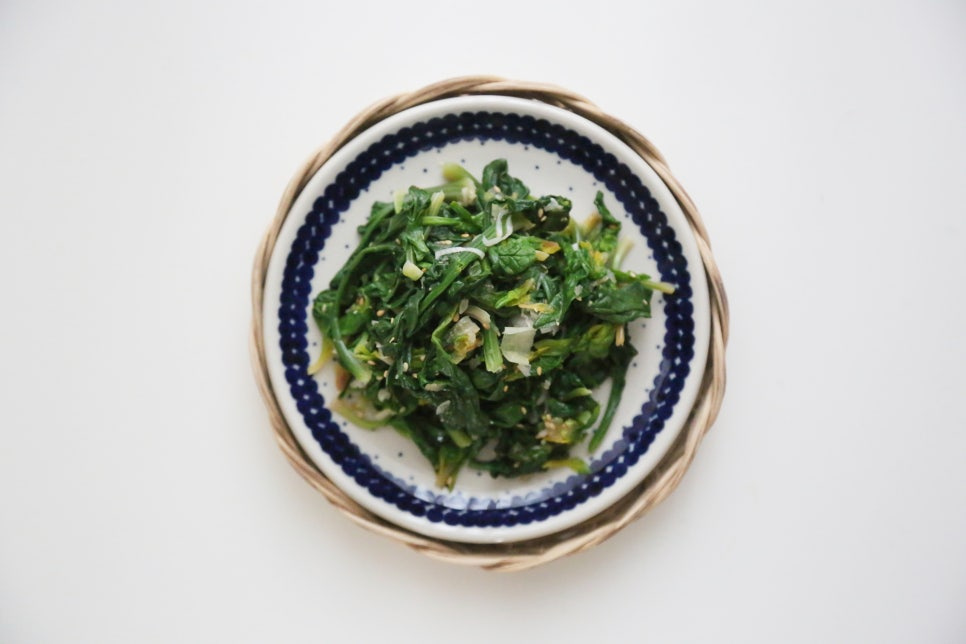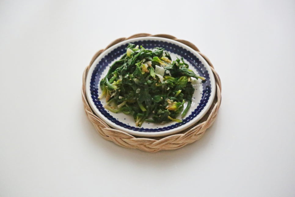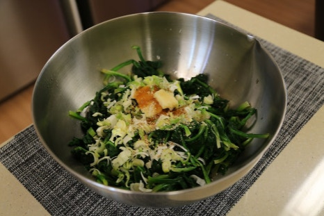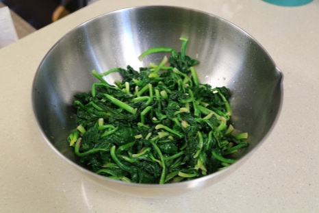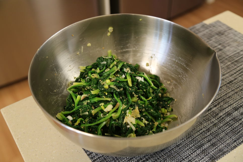 데친 섬초 600g, 다진 마늘 1스푼, 소금 1스푼, 깨소금 2스푼, 참기름 1.5스푼, 다진 대파 1/2대