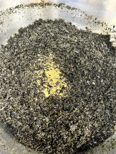 양념 넣기 김이 충분히 바삭해지면 불을 끄거나 아주 약불로 줄인 뒤, 설탕 1T와 맛소금 0.5T를 고루 뿌려 재빨리 섞어줍니다.
