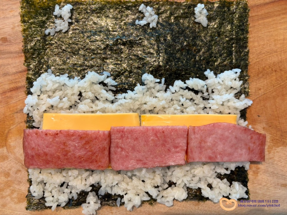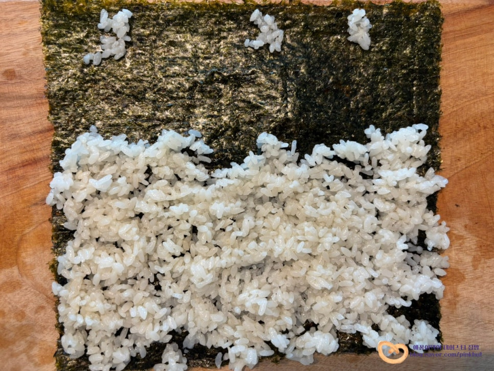밥을 최대한 얇게 절반 정도 깔아주세요. 잘 붙으라고 윗면에 밥풀도 조금씩 붙여주었어요.