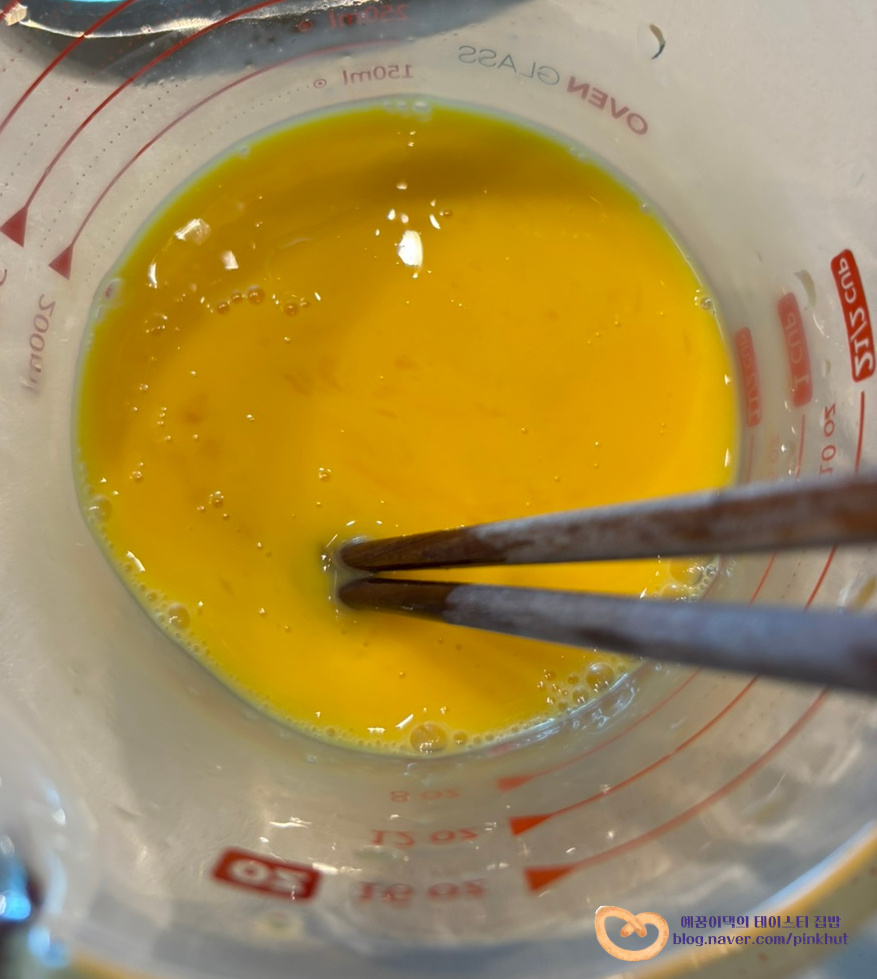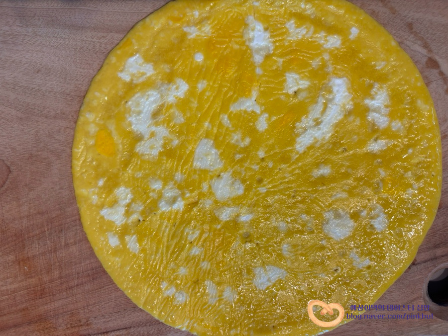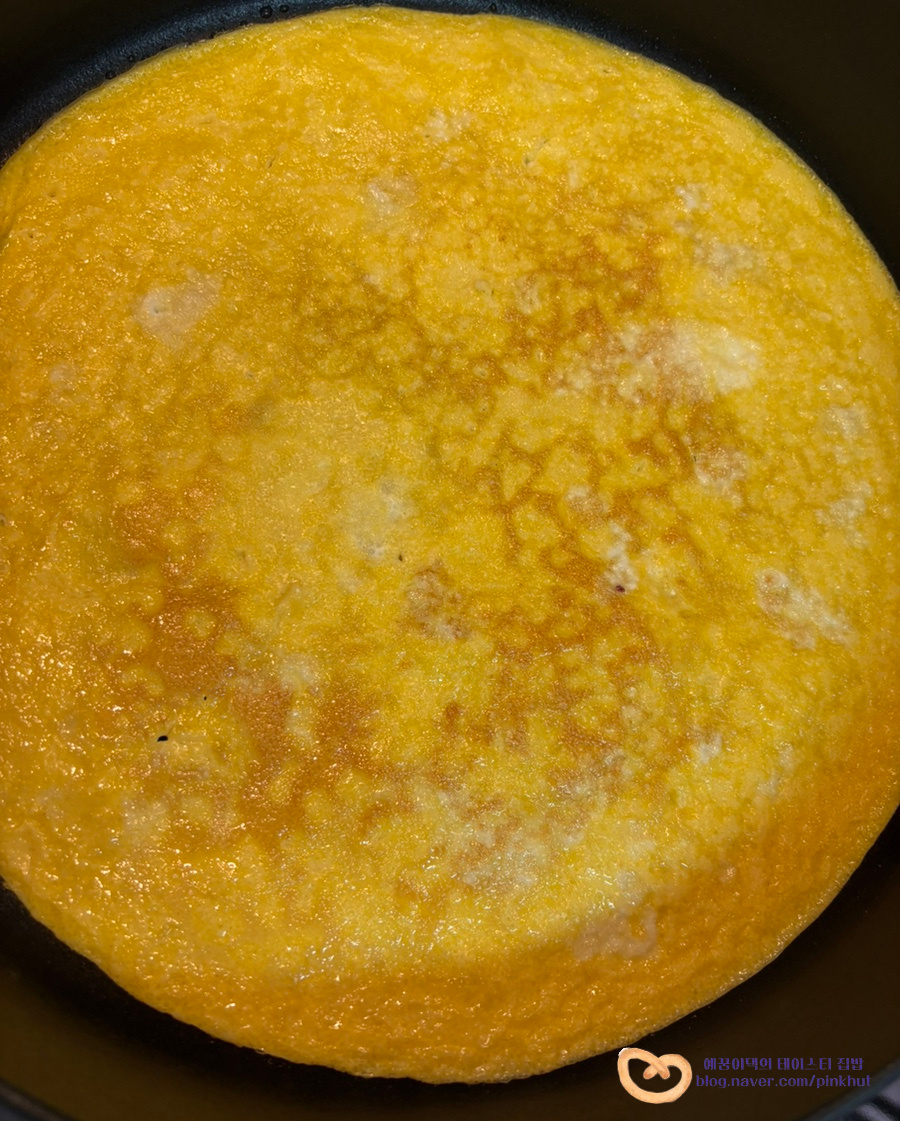계란물을 부어 약불로 익혀주고 젓가락이나 뒤집개로 뒤집어서 반대쪽도 익혀주세요.