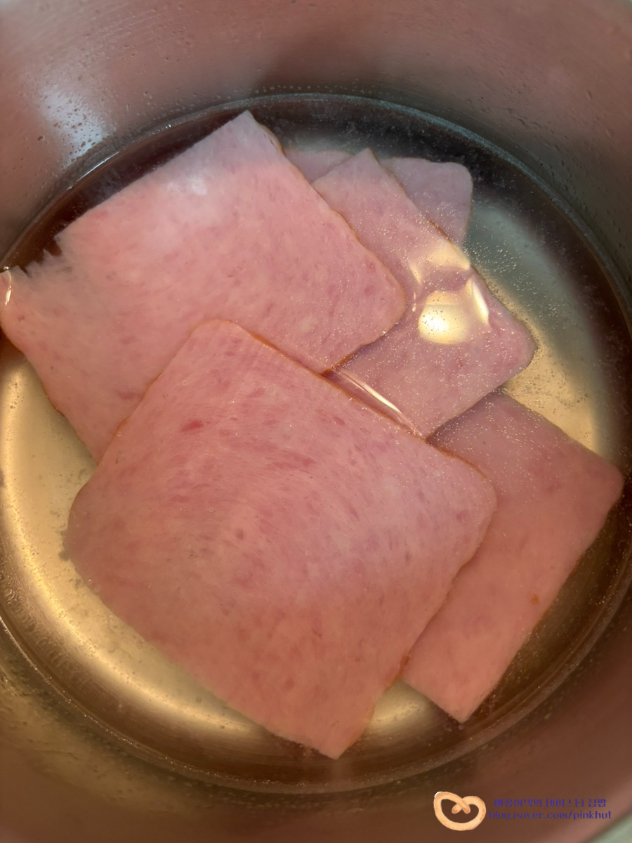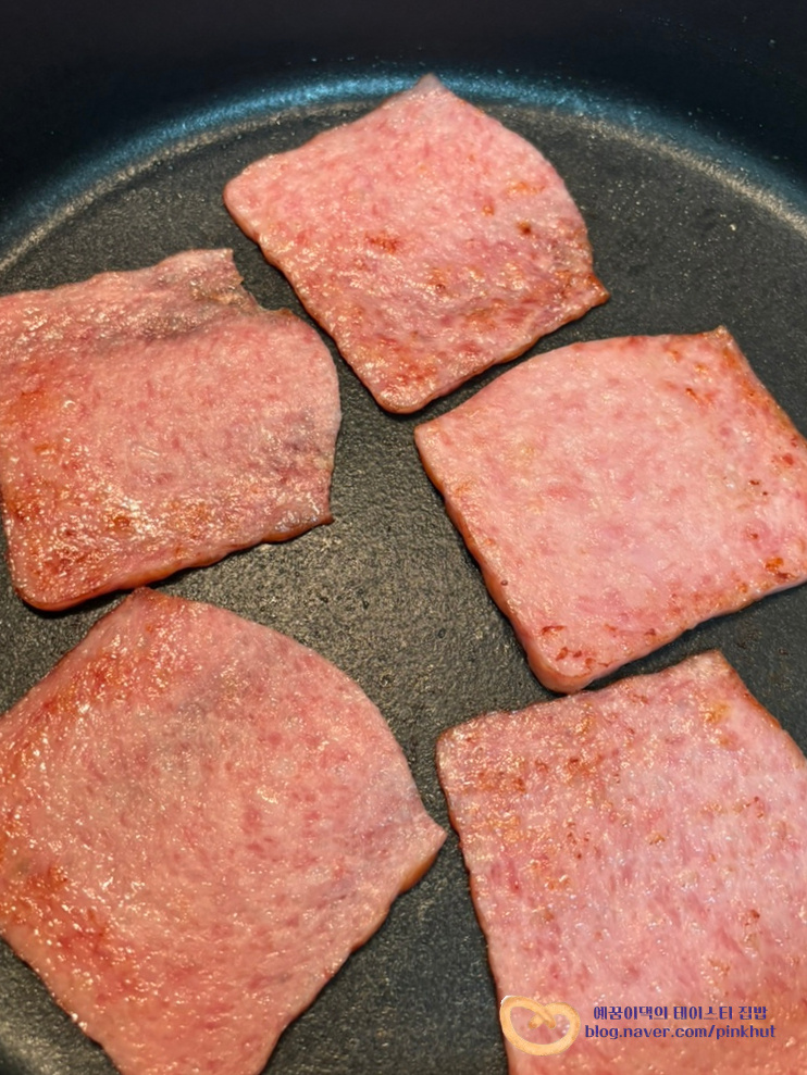 햄은 한번 구워주면 더 맛있어요. 앞뒤로 노릇노릇 구워주고, 반으로 잘라줍니다