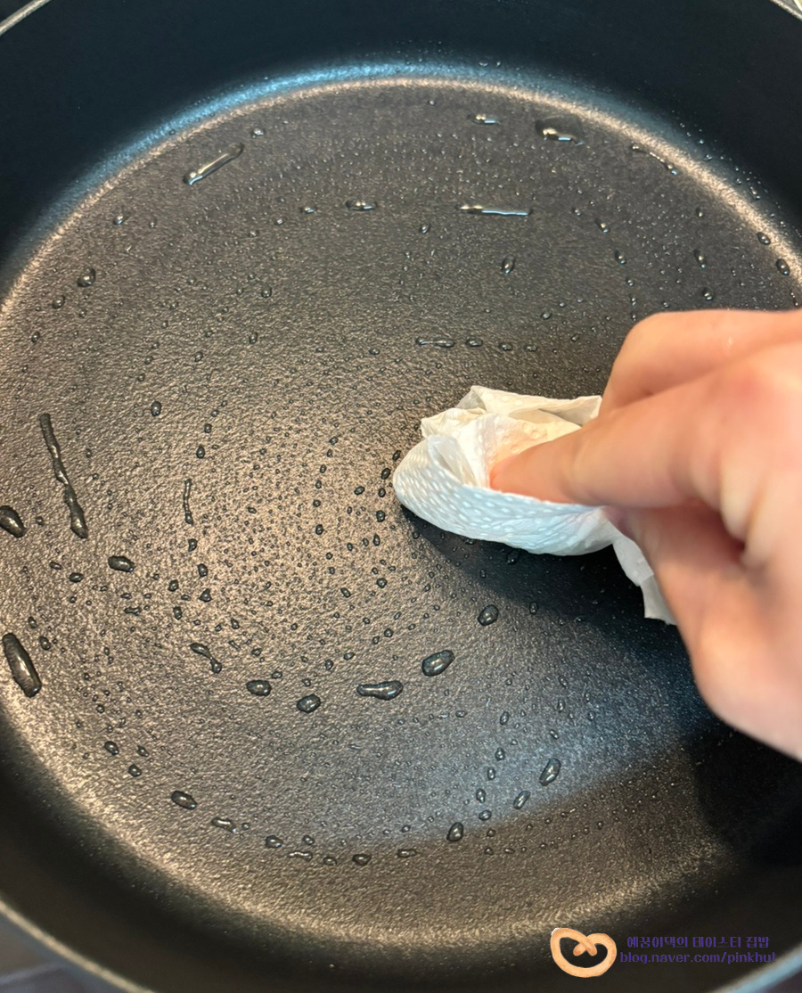 프라이팬은 약불로 예열 후 식용유 둘러주는데요, 사진처럼 키친타올로 가볍게 정리해 주세요.