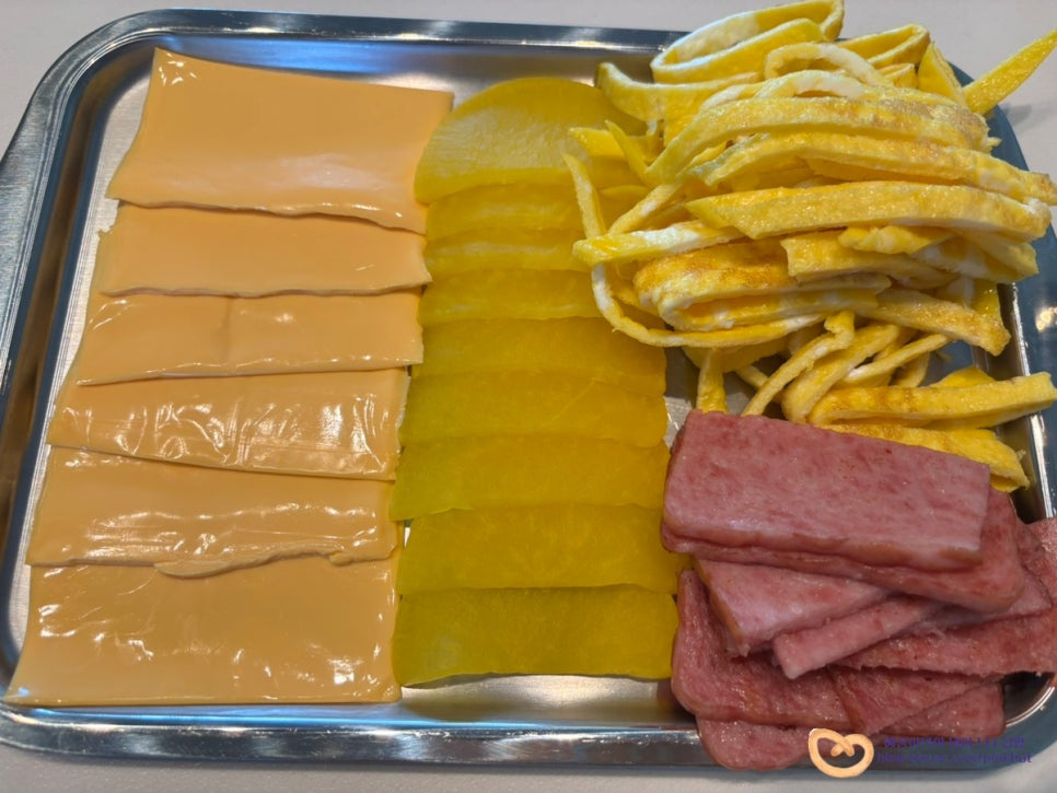 체다치즈, 슬라이스햄, 계란지단, 단무지 딱 4가지가 끝!
