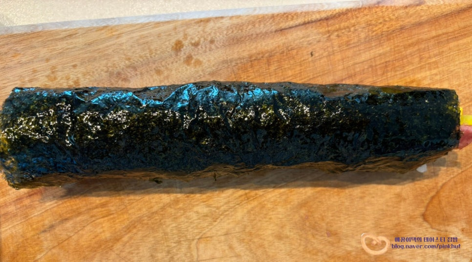 이음새 부분이 바닥으로 향하게 두고, 꼭 김밥 겉면에 참기름을 발라주세요.