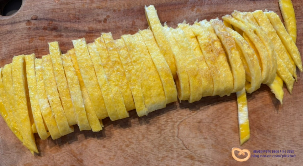 한 김 식힌 계란지단은 돌돌 말아서 채 썰어주세요.