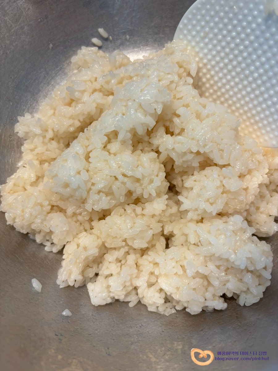 따끈한 밥 1공기 반 (350g)에 소금 1/3T, 참기름 2T를 넣어 밑간을 더해 줍니다