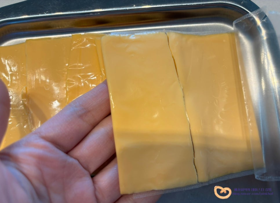 체다치즈는 3장 준비했어요 사진처럼 반으로 잘라주시고요,