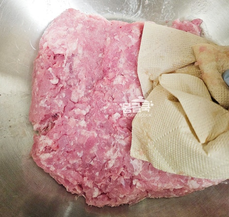 다짐육은 키친타월로 가볍게 눌러 핏물을 제거해 주세요.