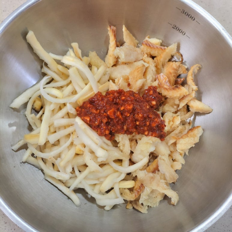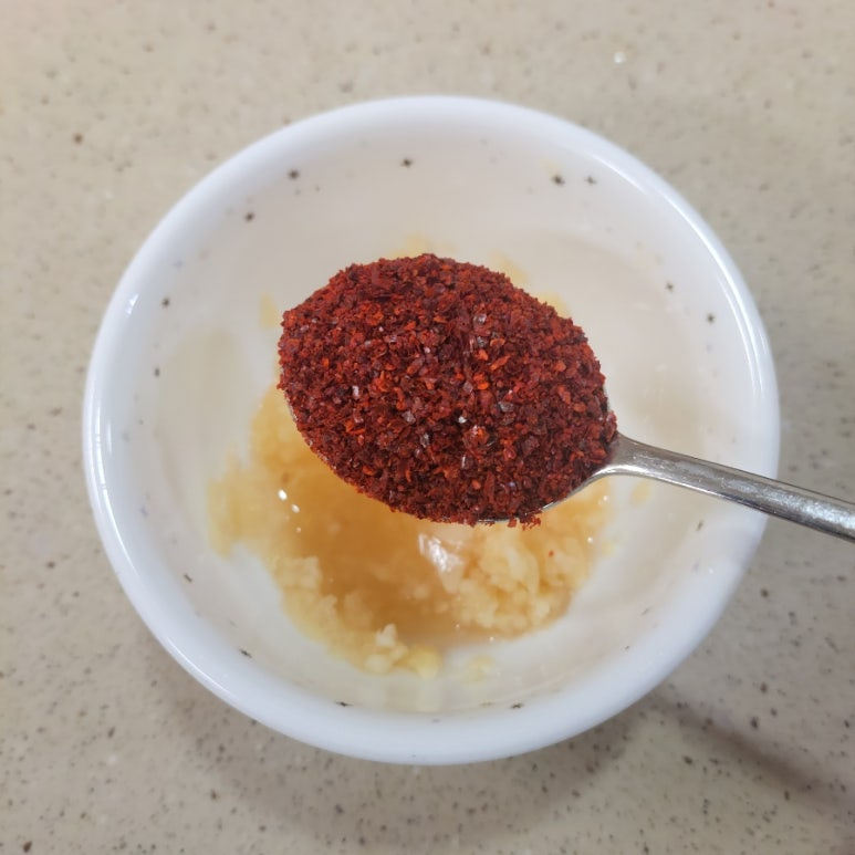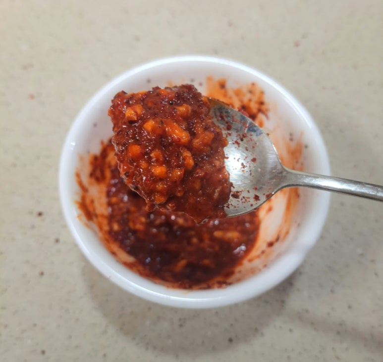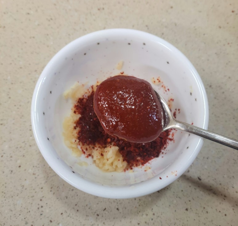- 간 마늘 1 T , 사과 식초 4 T , 고추장 1 T , 고춧가루 1 T , 액젓 1 t , 참깨가루