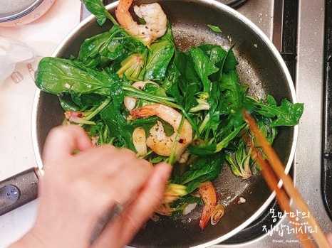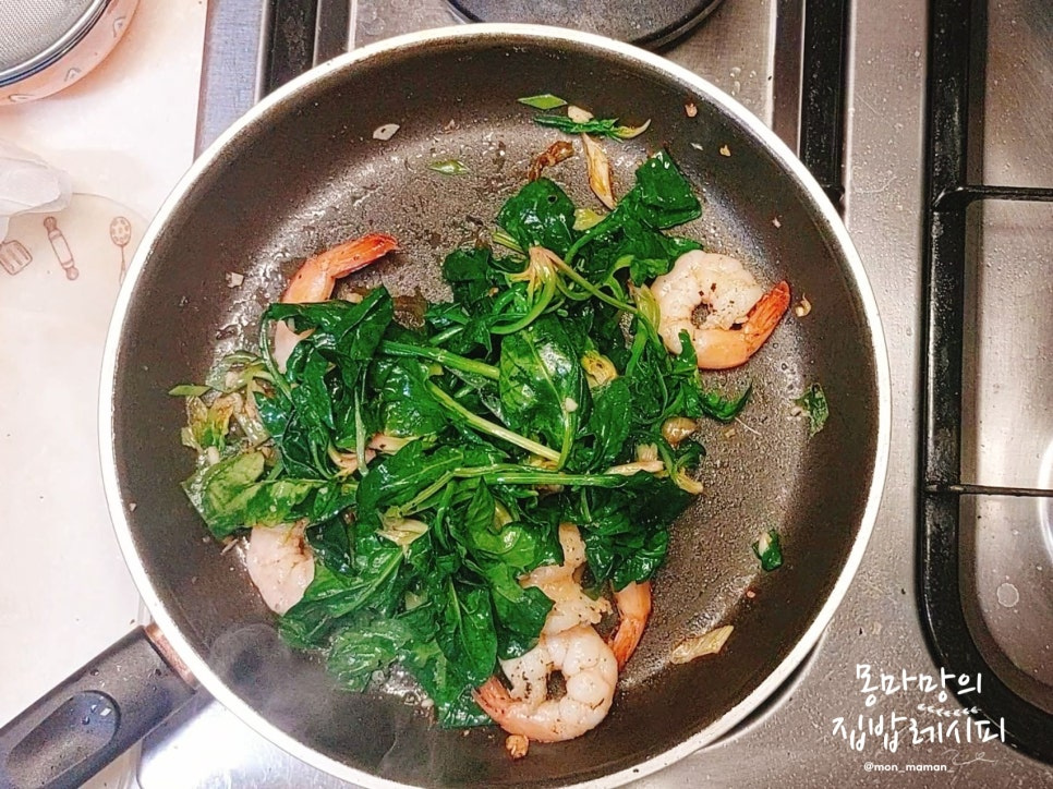 새우가 익으면 시금치를 넣고 뒤집어가며 볶아주세요.
