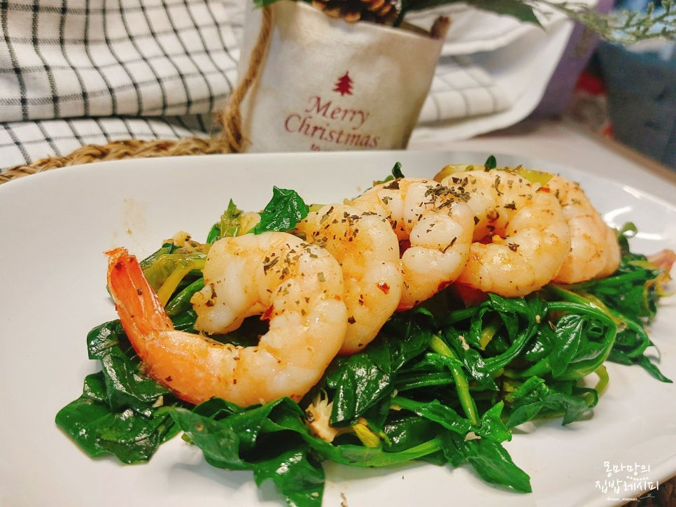 시금치를 아래깔고, 위에 새우를 올린 후 바질가루를 뿌려주시면 완성돼요^^