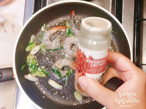 향이 잘 나면 새우를 넣은 후 소금, 후추, 바질가루, 페퍼론치노를 넣고 잘 구워주세요.