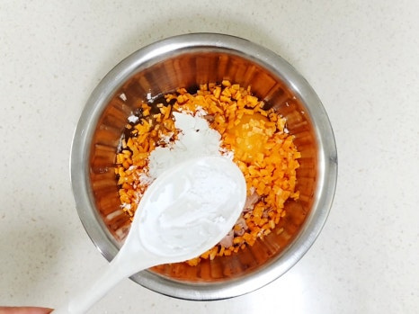 전분가루 대신 밀가루 1T 대체 가능해요. 많이 넣으면 텁텁해지니 접착력이 약간 생길 정도만 넣어요.