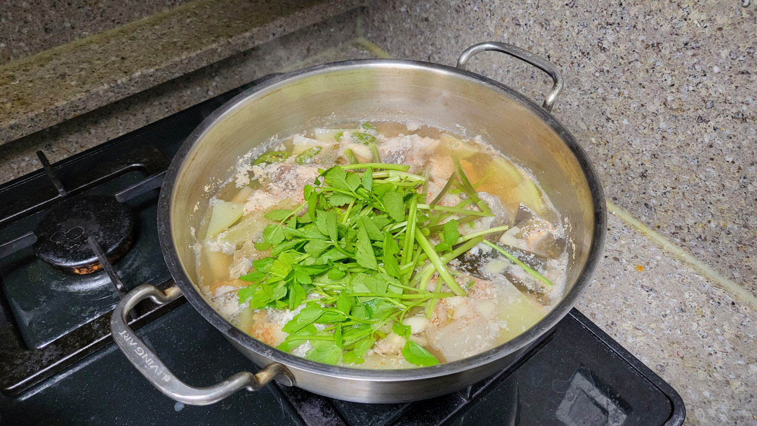 다 익으면 미나리 좀 썰어 넣고 뚜껑을 닫아 잔열로 익힌다.