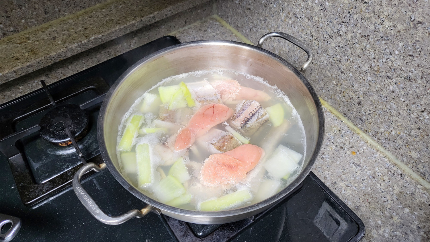 끓여 놓은 육수의 불을 낮추고 명란과 동태를 조심스레 넣었다.