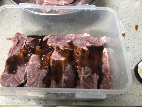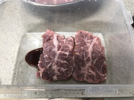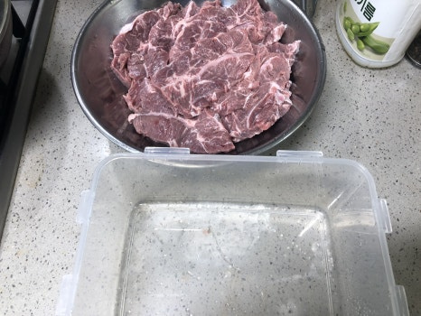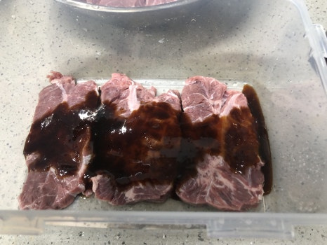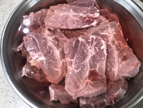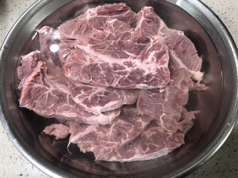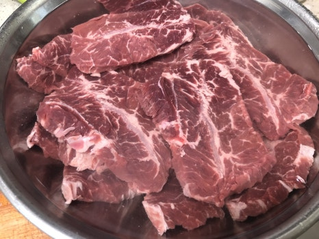 손질된 고기는 차가운물에서 30~60분 사이 담궈서 핏물을 제거해 줍니다.