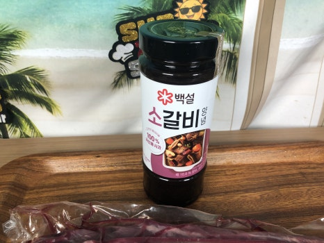 소갈비시판소스(500ml)를 개봉후 통에 바닥에 살짝 뿌려 줍니다.