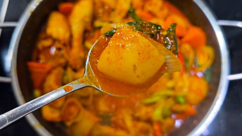 양념은 과하지 않고, 닭 특유의 고소한 맛을 살리면서 감자와 채소에까지 간이 깊게 배어