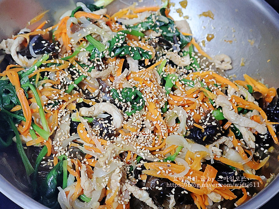 따로 옮겨 놓았던 야채 볶은 것을 넣고 참기름 2큰술 넣어줍니다