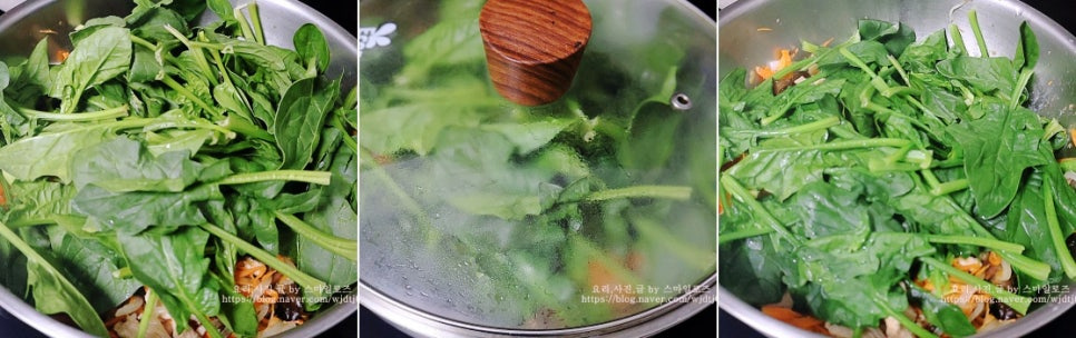시금치 씻어놓은 것을 올려주고 약불에서 뚜껑 덮고