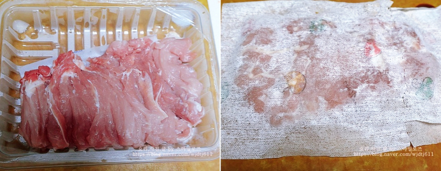 돼지고기는 키친티월로 톡톡 두들겨 핏물 제거를 해줍니다