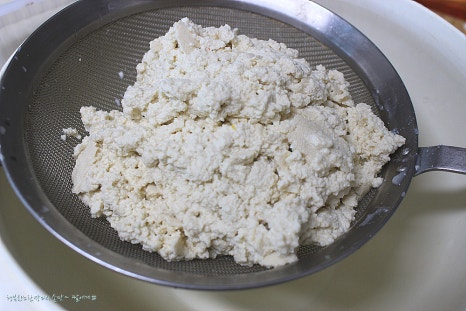 아주 가는 채에 얹어 무거운거 올려 물기를 빼줘요~