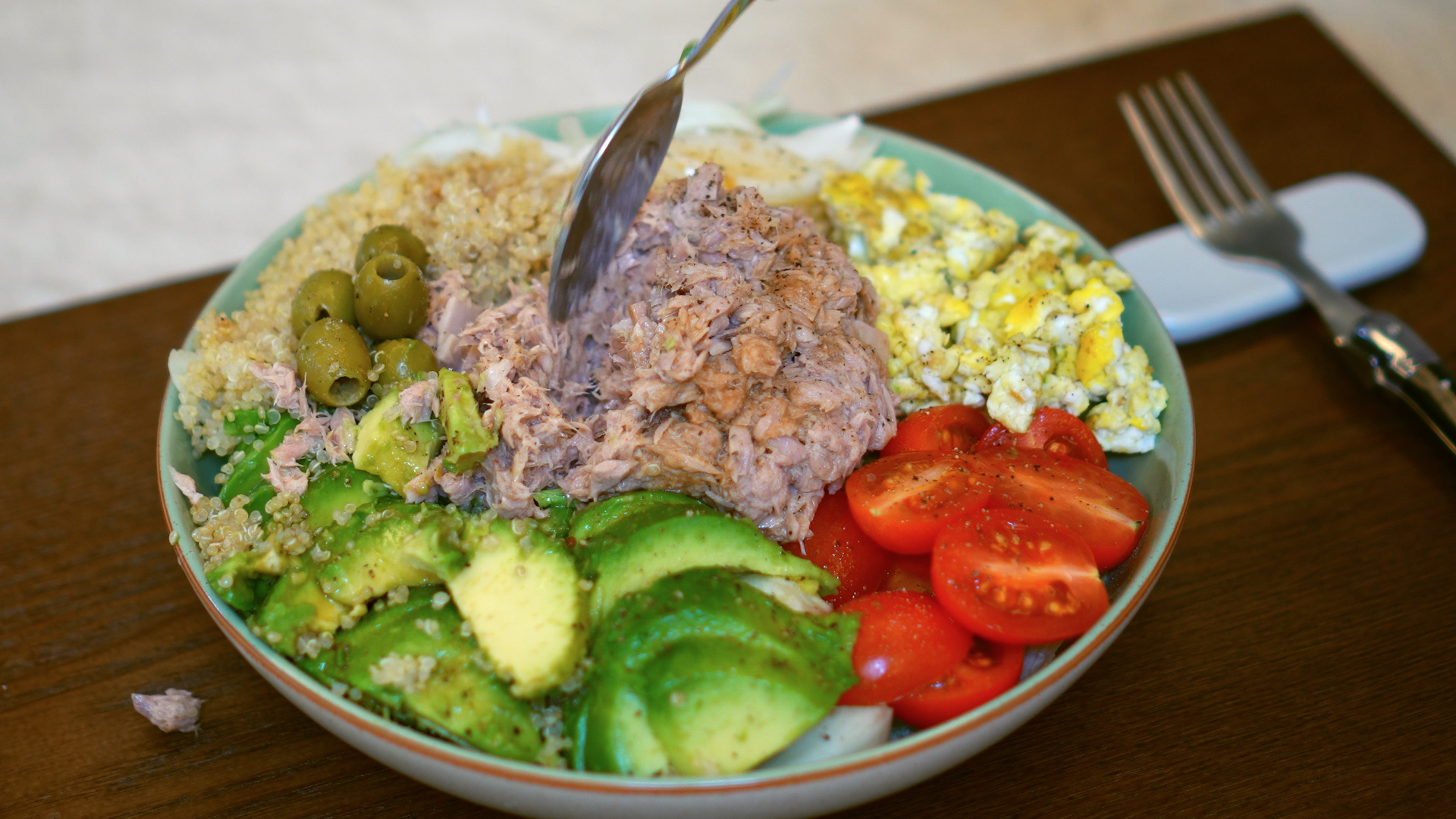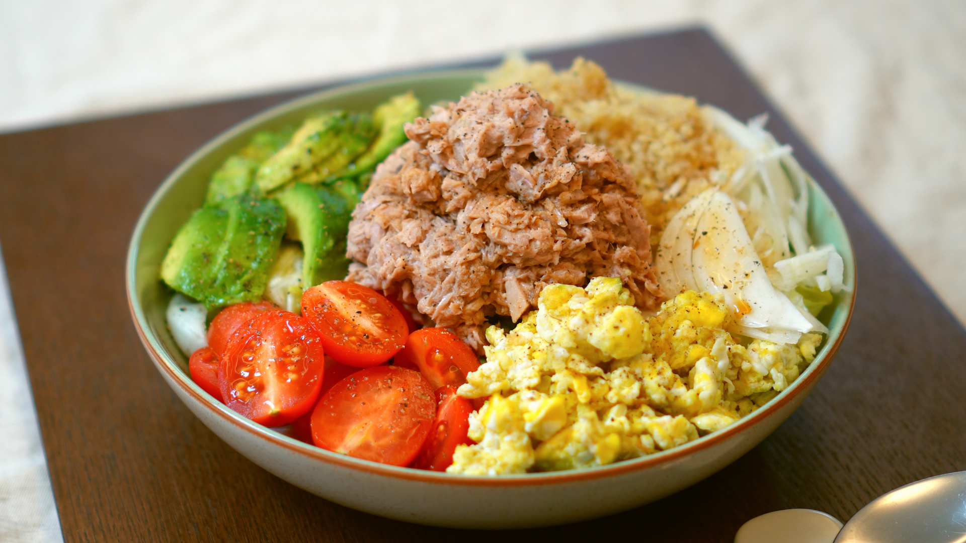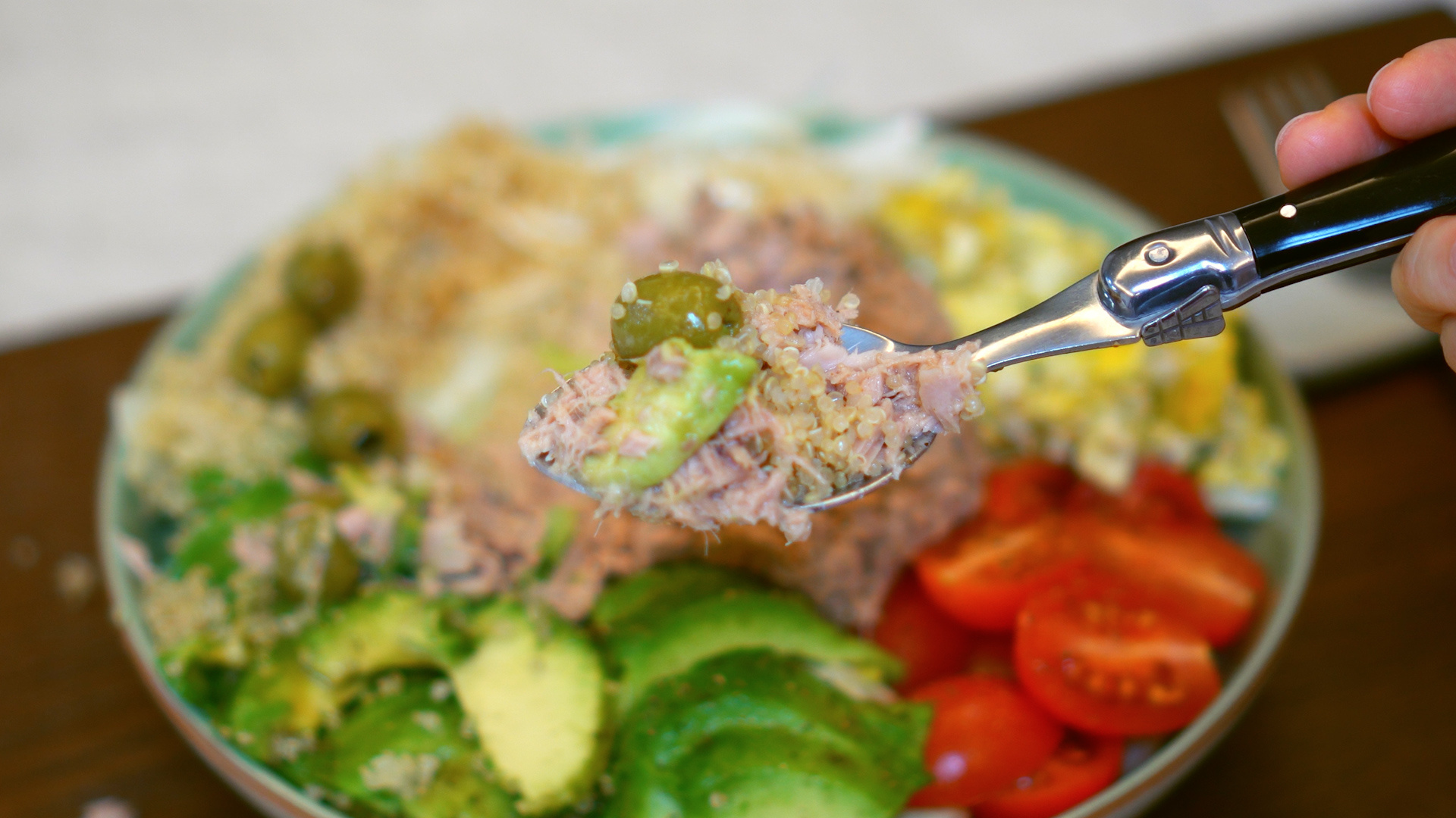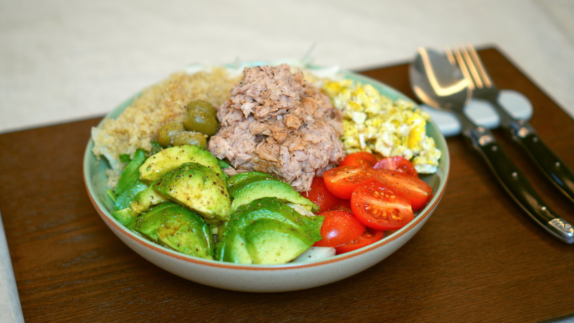 참치 2 캔 , 아보카도 1 개 , 양파 1/2 개 , 퀴노아 1 컵 , 양상추 1/2 개 , 계란 3 개 , 방울토마토 , 그린올리브
