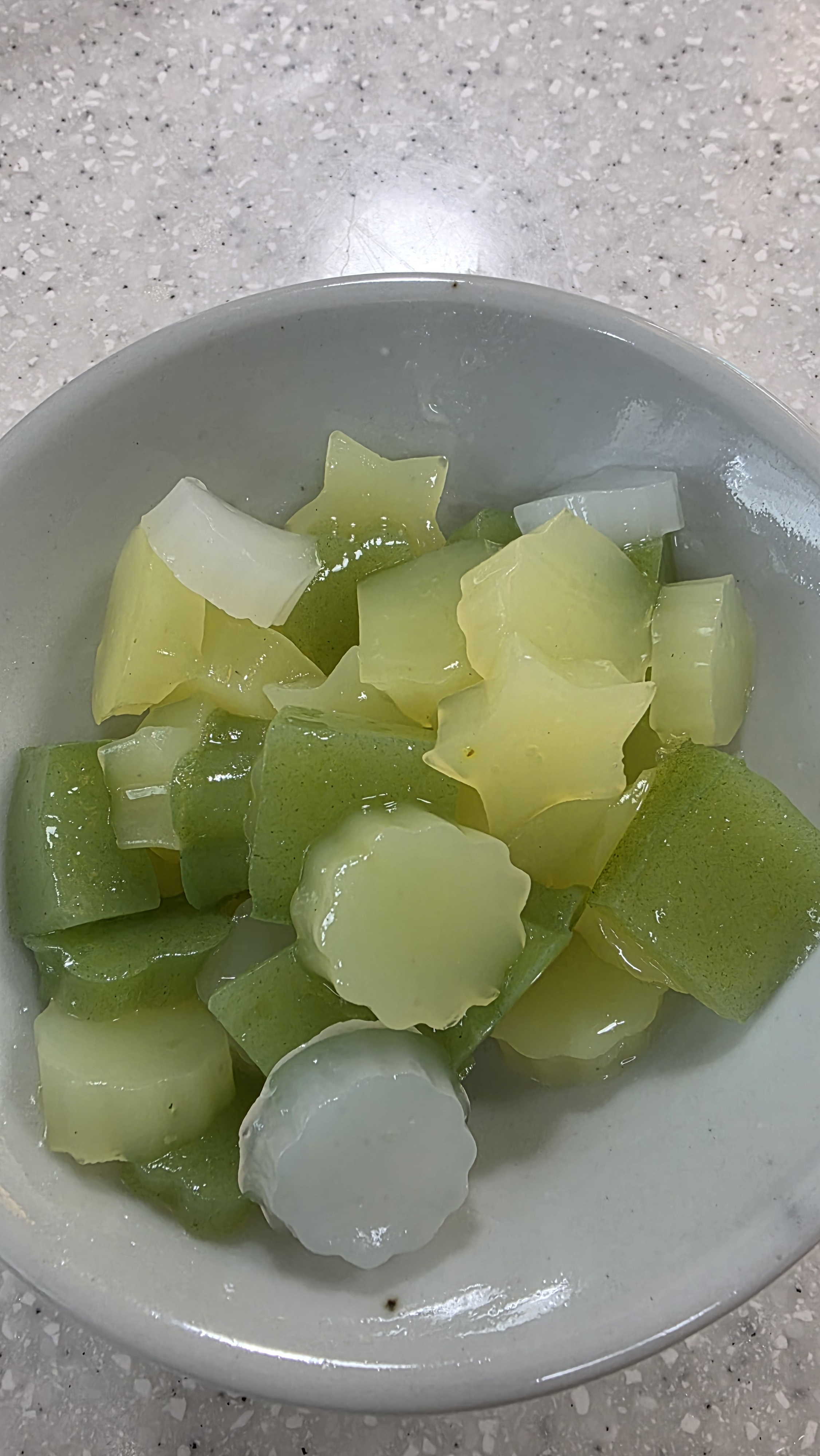 손으로도 혀로도 으깨지는 청포묵은 얇게 썰어서 준비한다.충분히 부드럽기 때문에 뜨거운 물에 데치지 않아도 된다.오미자 우려낸 물을 넣어 낭화를 만든다.