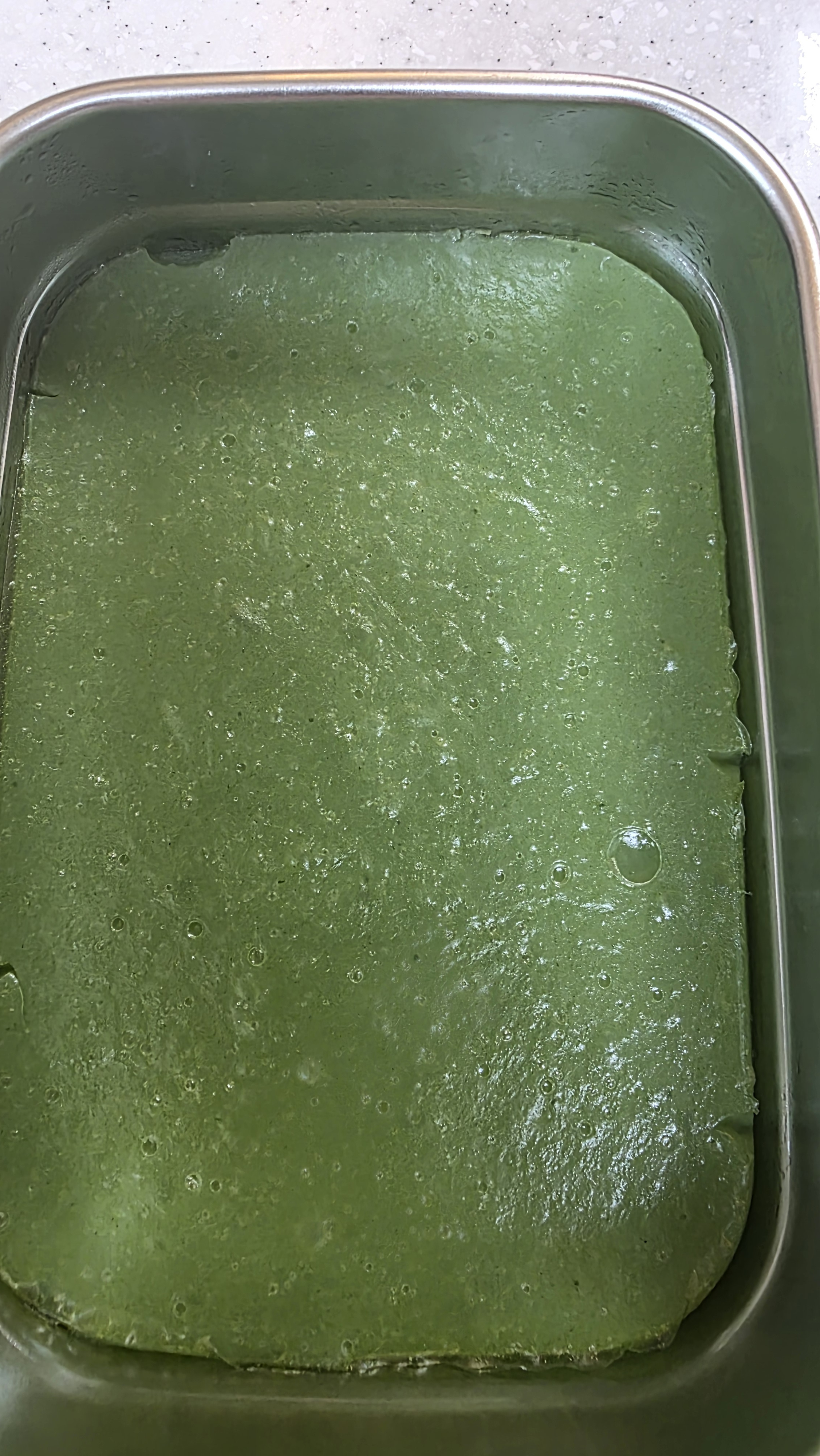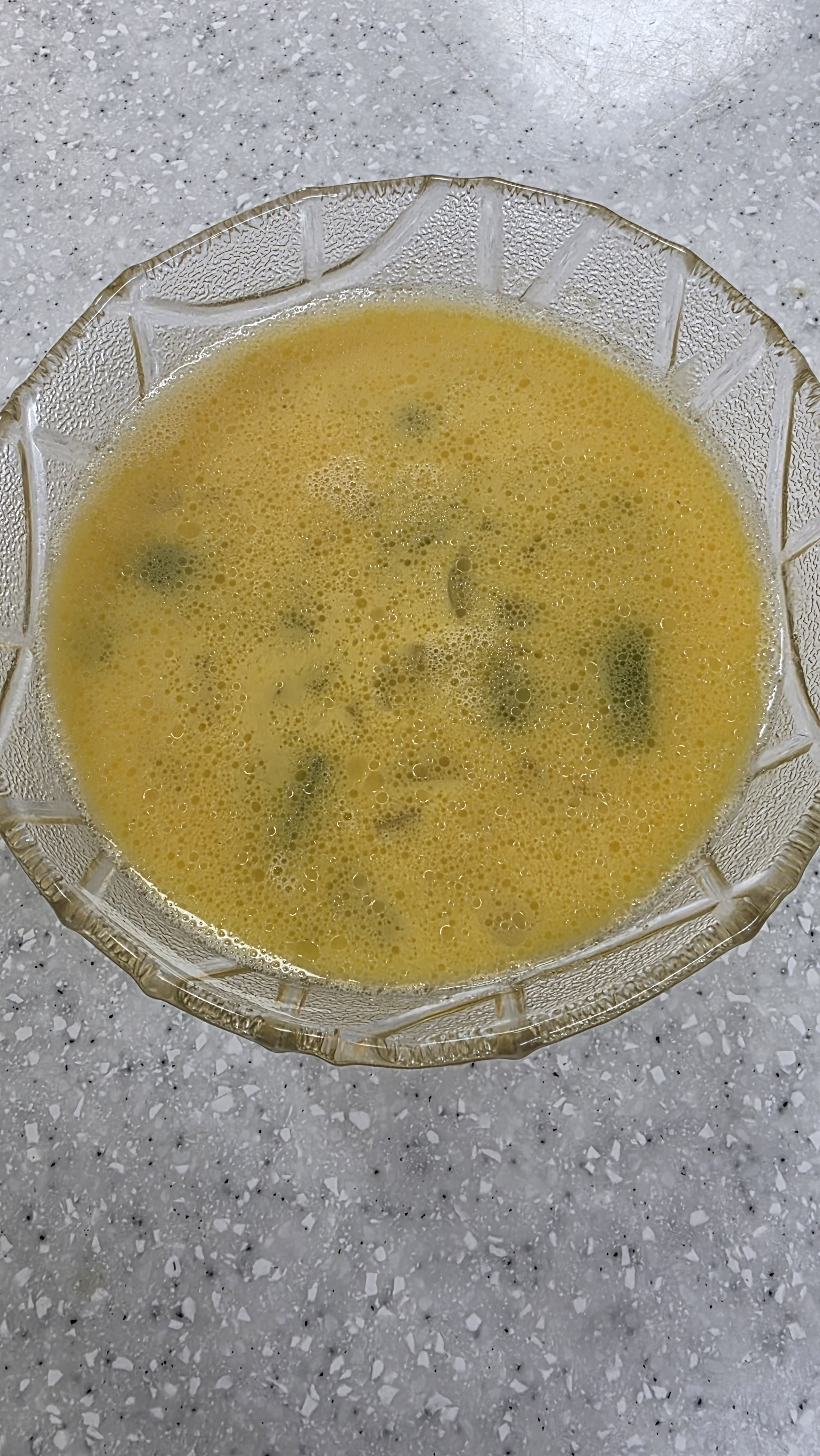 달걀 2 개 , 백간장 1 T , 물 1050 ml , 소금 1 g , 참기름 1 t , 녹두가루 100 g , 치자물 2 T , 새싹보리 5 g , 푸디 0.9 g