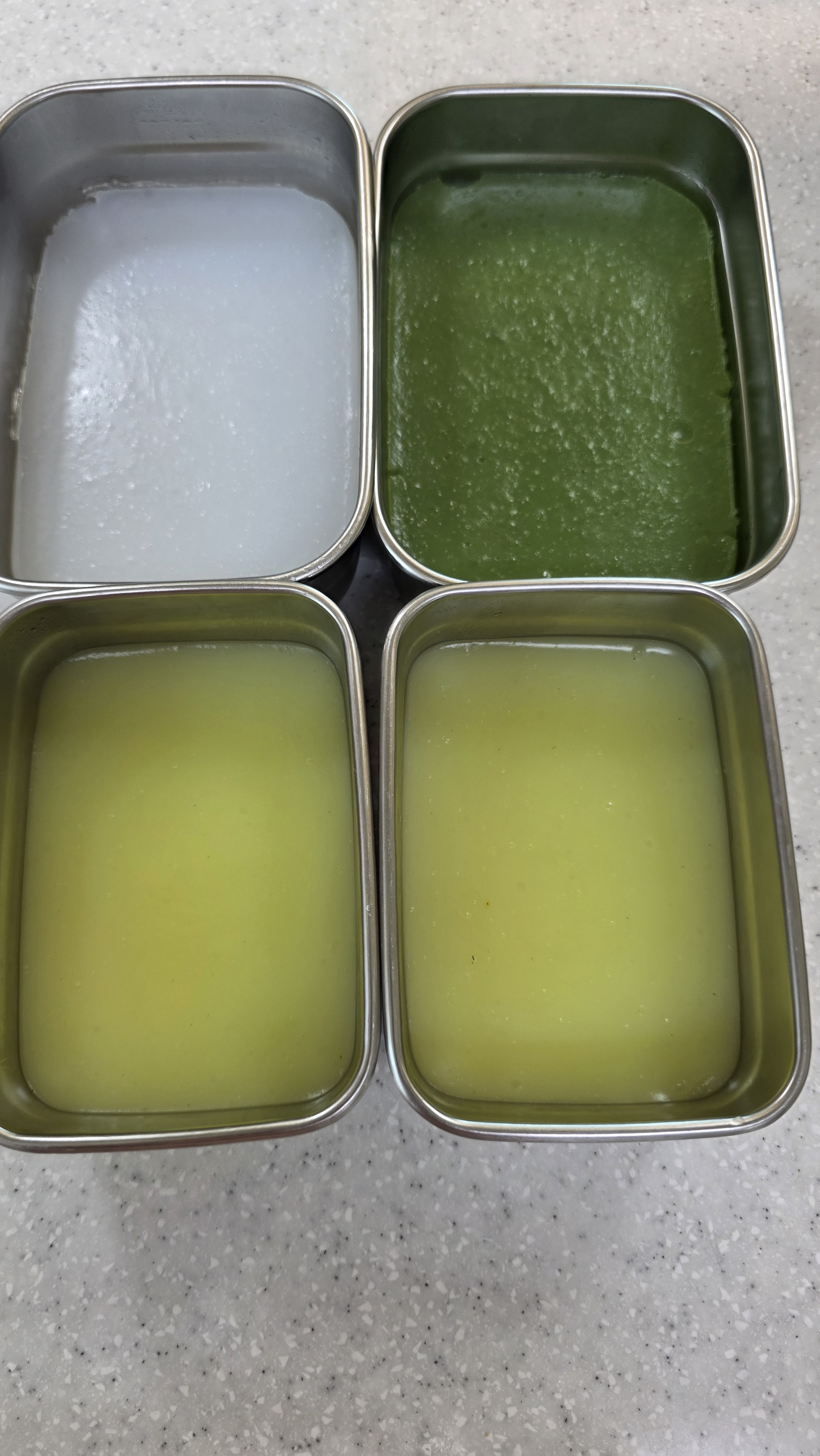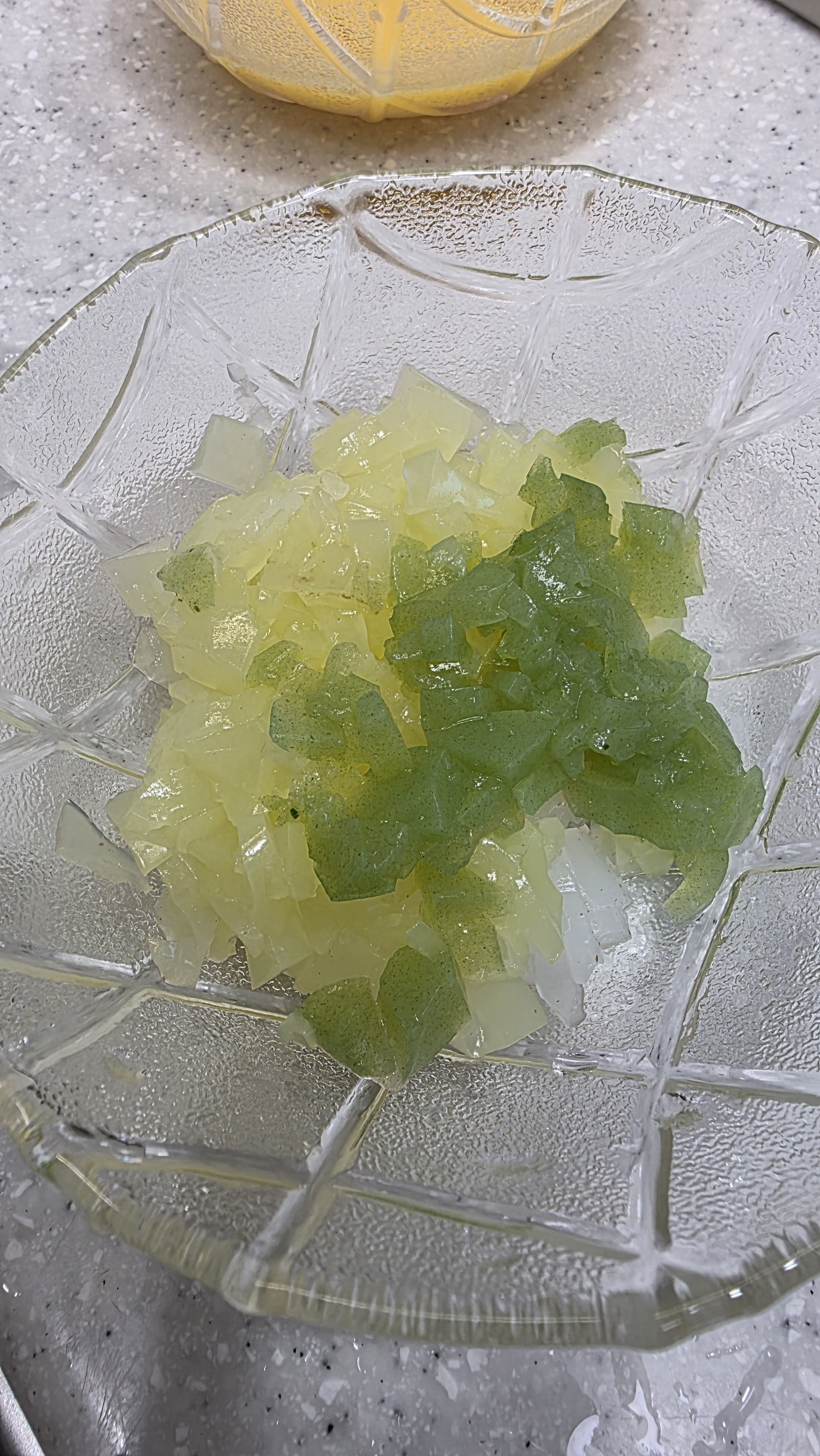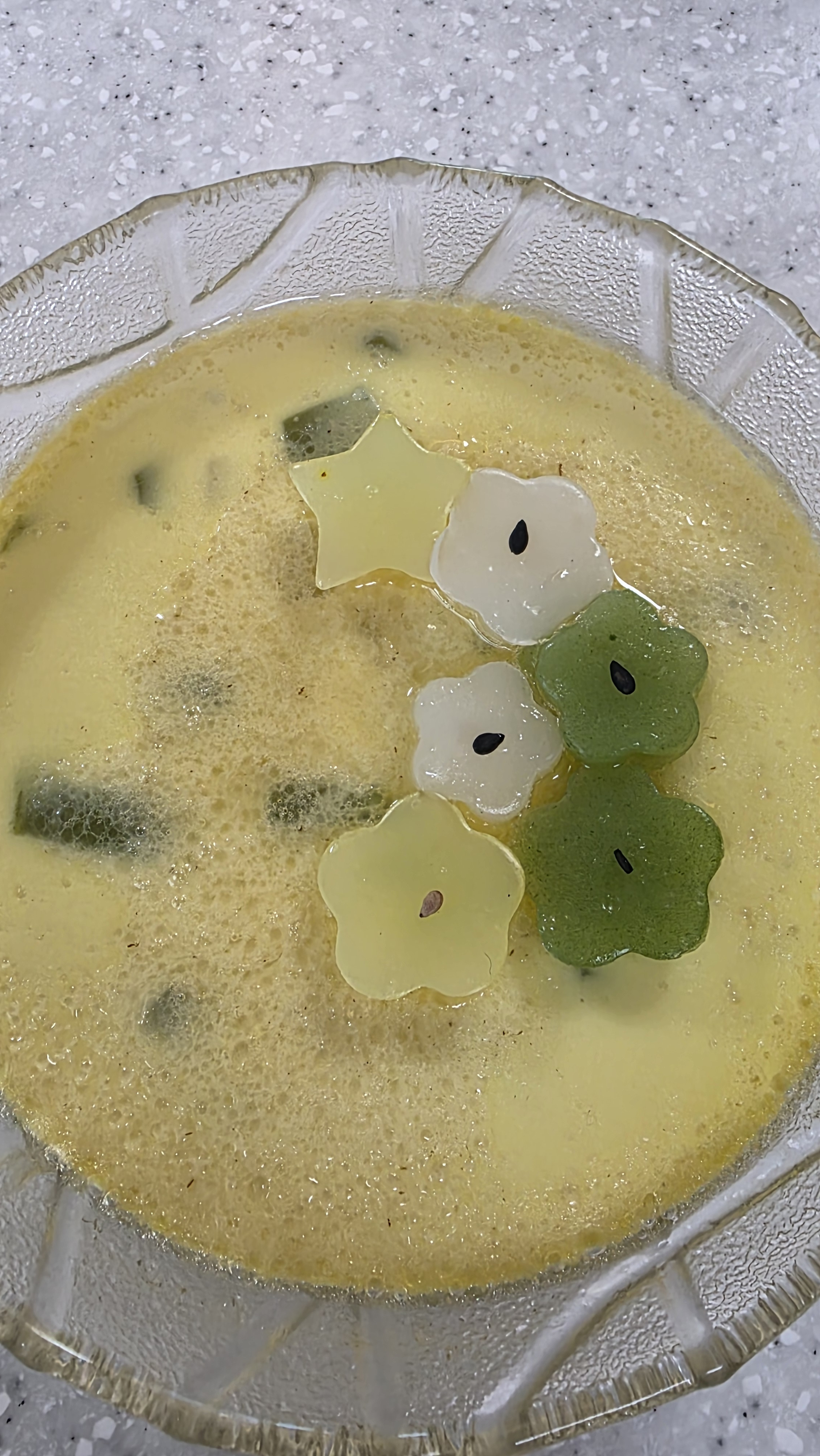너무 물대신 약간의 연하푸디를 넣어 살짝 점도있게 했다. 계란찜도 연하젤을 넣어 점도와 삼킴 안정성을 최대한 확보했다. 청포묵은 색을 넣어(치자,새싹보리) 약간 알록달록하게 만든 다음 고명도 얹었다.