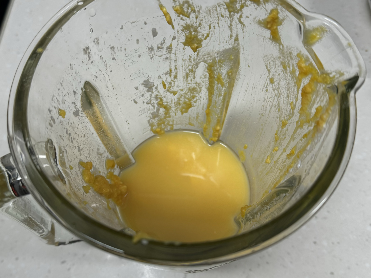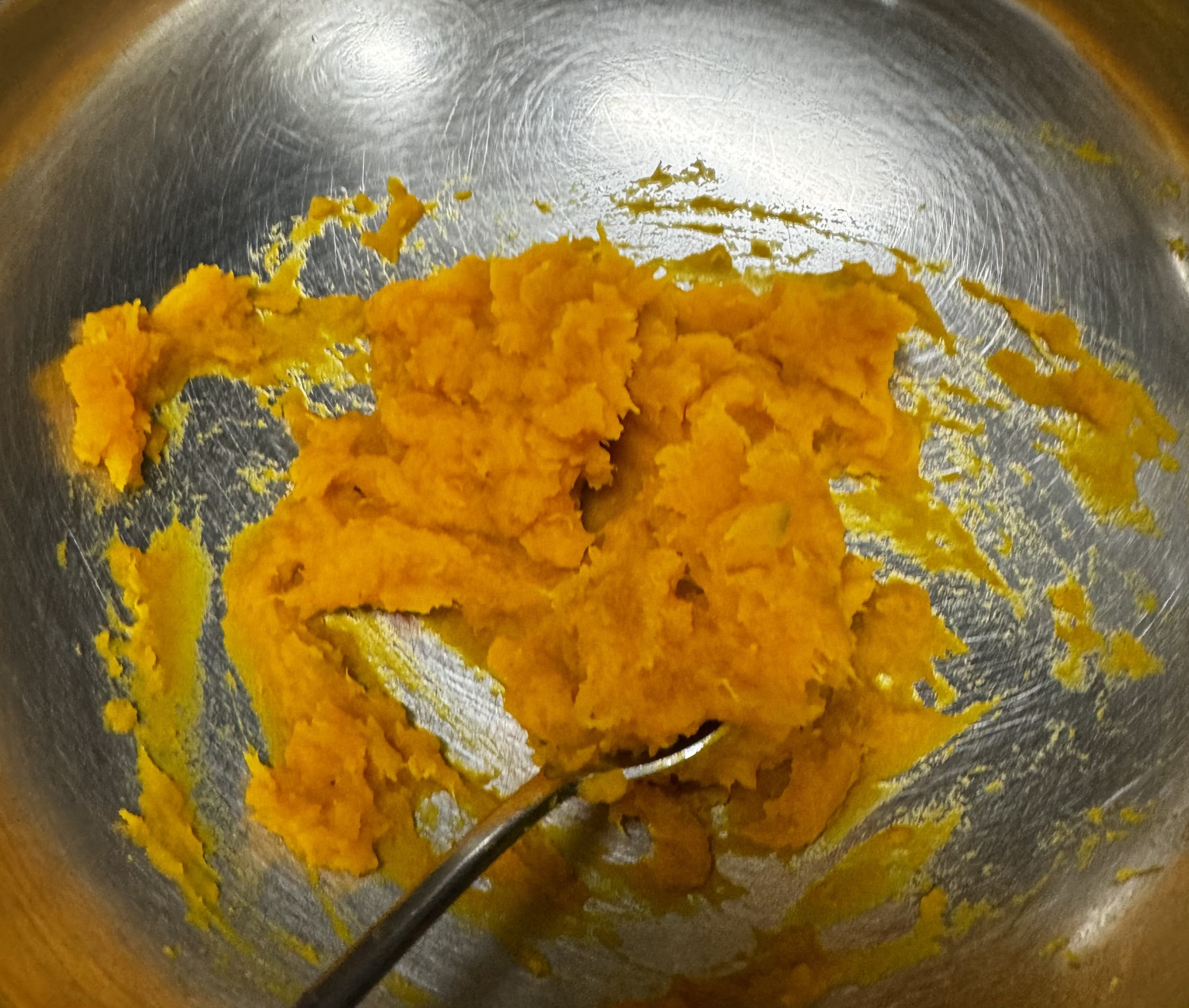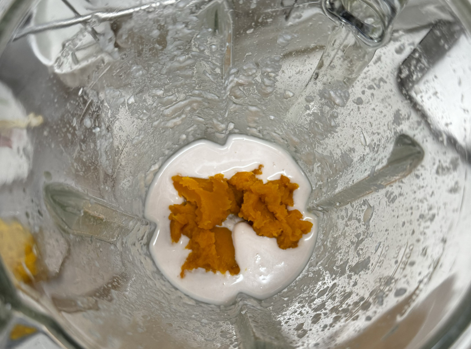 닭가슴살을 우선 곱게 갈아 입자가 전혀 느껴지지 않게 만들고, 단호박을 넣어 섞이게 만들며 곱게 갈아줍니다.