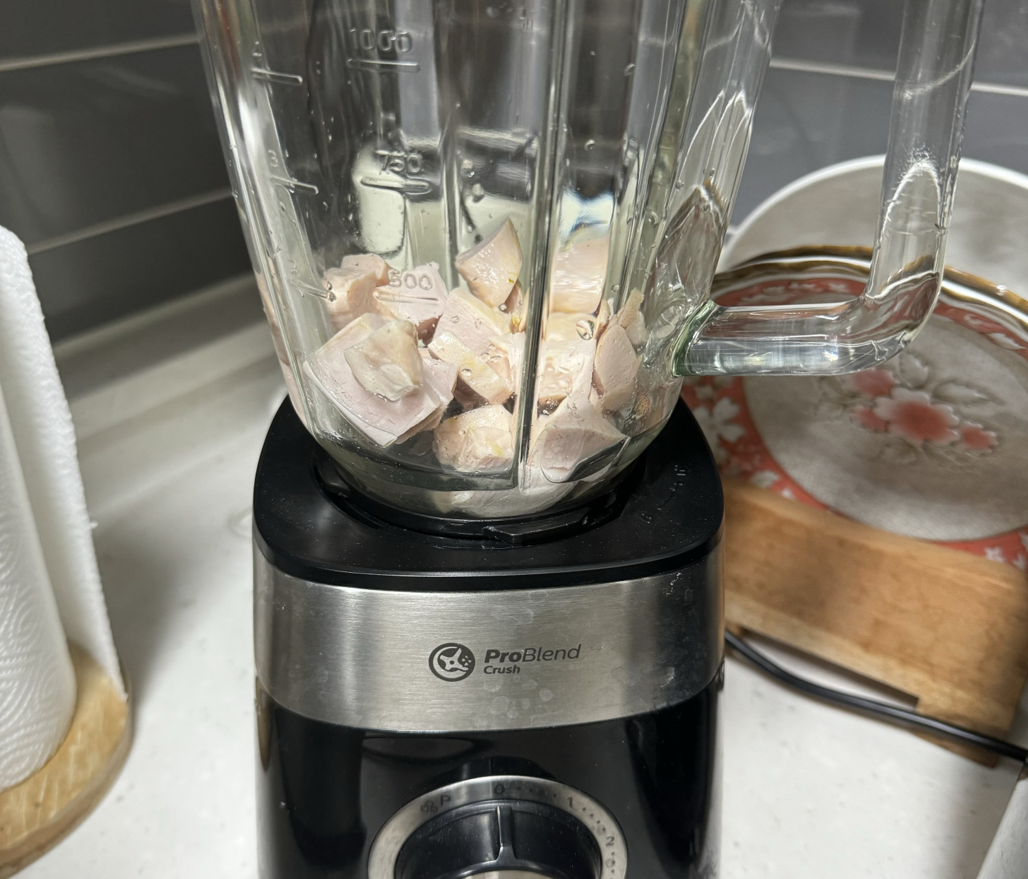 단호박은 숟가락으로 으깨주고, 닭가슴살은 한 입 크기로 썰어 믹서기에 소량의 물과 함께 넣어줍니다.