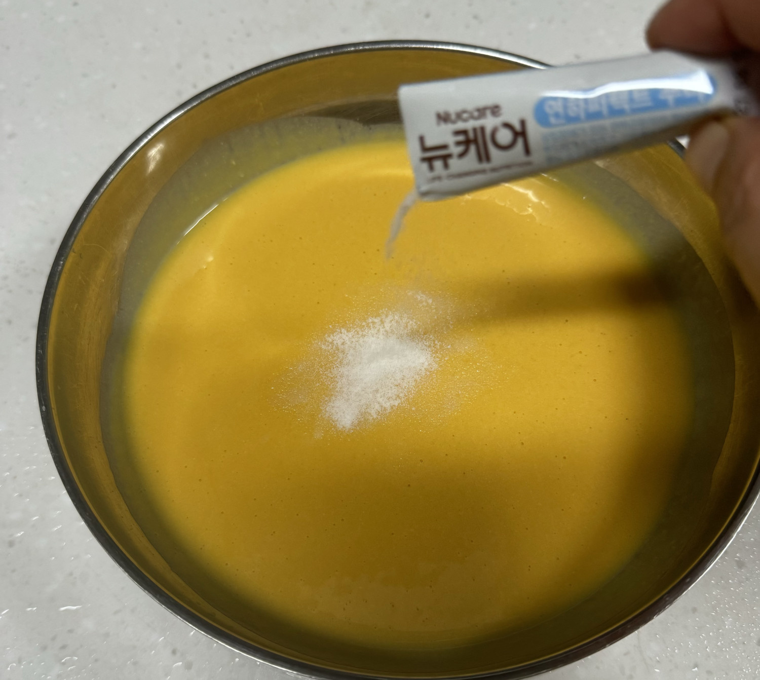 뉴케어 연하퍼펙트 푸디 2포를 넣고 잘 섞어 죽이 될 정도의 농도로 만들어줍니다