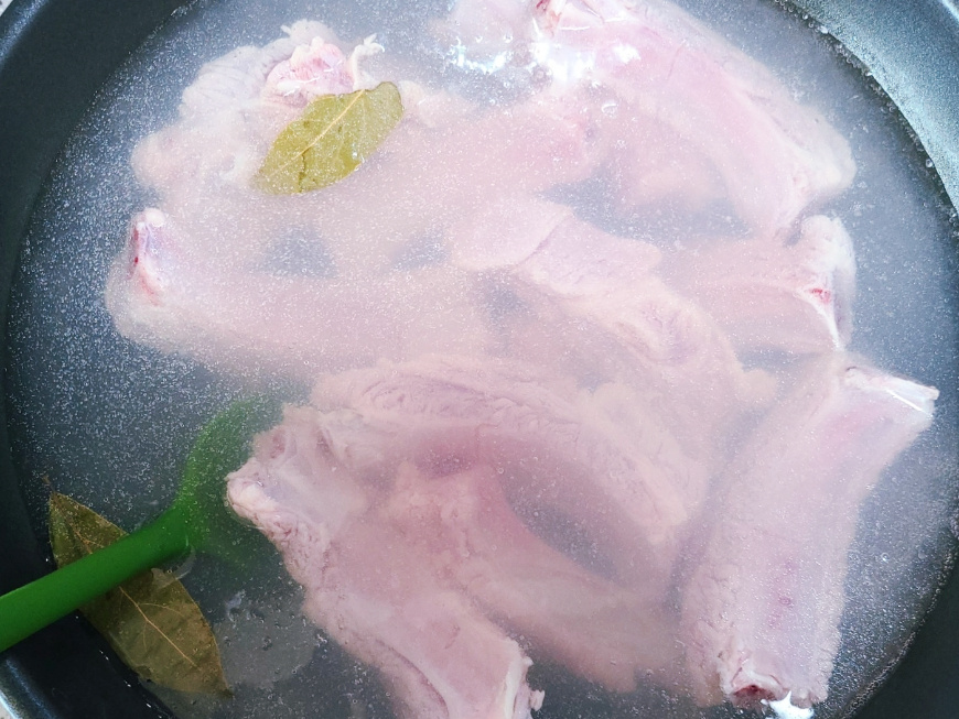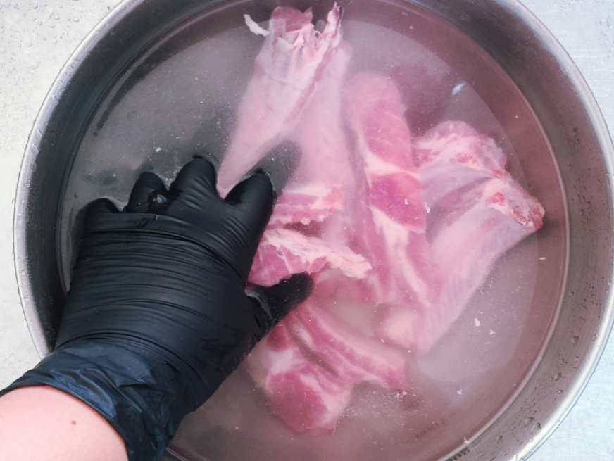 (등갈비를 데쳐서 요리를 할 경우에는 핏물을 빼지 않아도 요리 완성 후 잡내가 나지 않지만, 냉동 등갈비로 요리를 할 경우에는 물에 30분 이상 담가서 핏물을 빼 주어야 누린내와 잡내 없이 등갈비찜을 완성할 수 있어요)