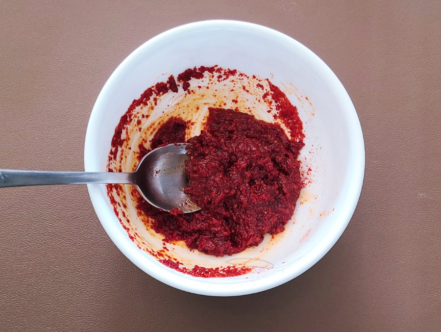 고춧가루 2.5큰술, 설탕 0.7큰술, 국간장 1큰술, 들기름 2큰술을 넣고 잘 섞어줍니다.