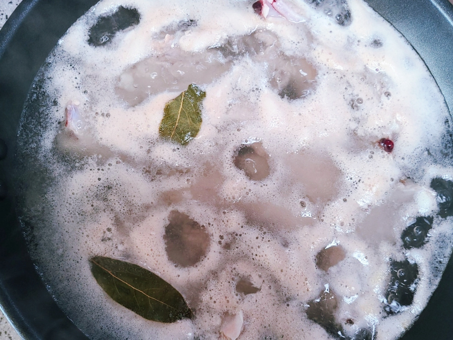 냄비에 물 900ml, 월계수잎 2장, 소주 30ml 정도를 넣고 가스불 센불에 올려줍니다.