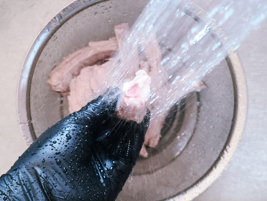 데친 등갈비를 채반에 쏟은 다음에 뼈 끝에 동글동글한 핏물이 붙어 있으면 손으로 긁어 떼어내고, 흐르는 물에 하나씩 세척해줍니다.