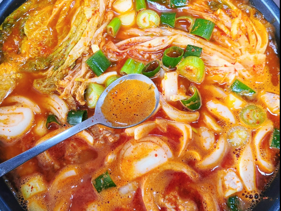 물 1리터를 넣고 가스불 센불에 올리고 양념을 골고루 풀어주면서 뒤적여줍니다.