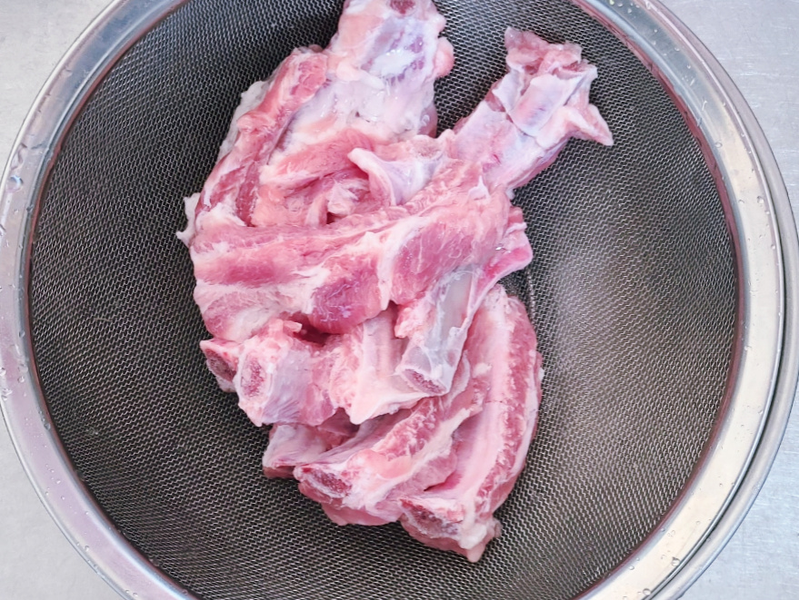 돼지 등갈비 500g 정도 준비하여 볼에 등갈비가 잠길 정도의 물을 받아서 손으로 주물주물 하면서 4번 정도 물을 바꿔가며 세척하고, 채반에 담아 물기를 빼 줍니다.