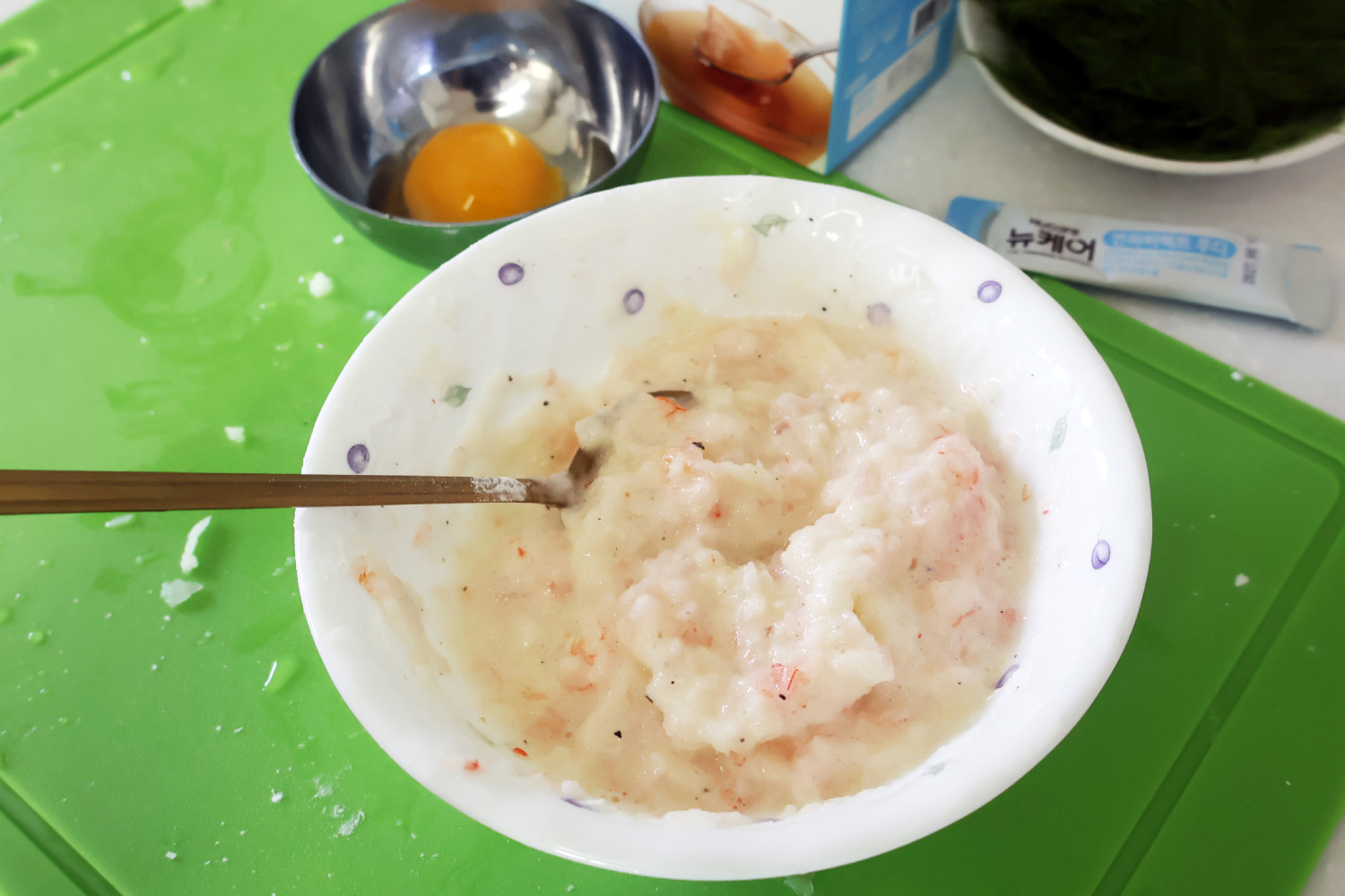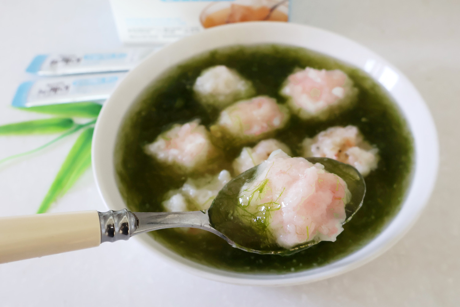 감태스프를 그릇에 담고 새우완자를 올려주세요