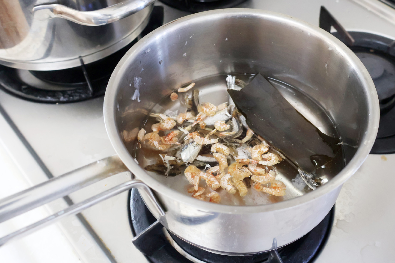 멸치와 다시마,보리새우를 넣고 푹 끓여주고 건져 맑은 육수를 준비하세요