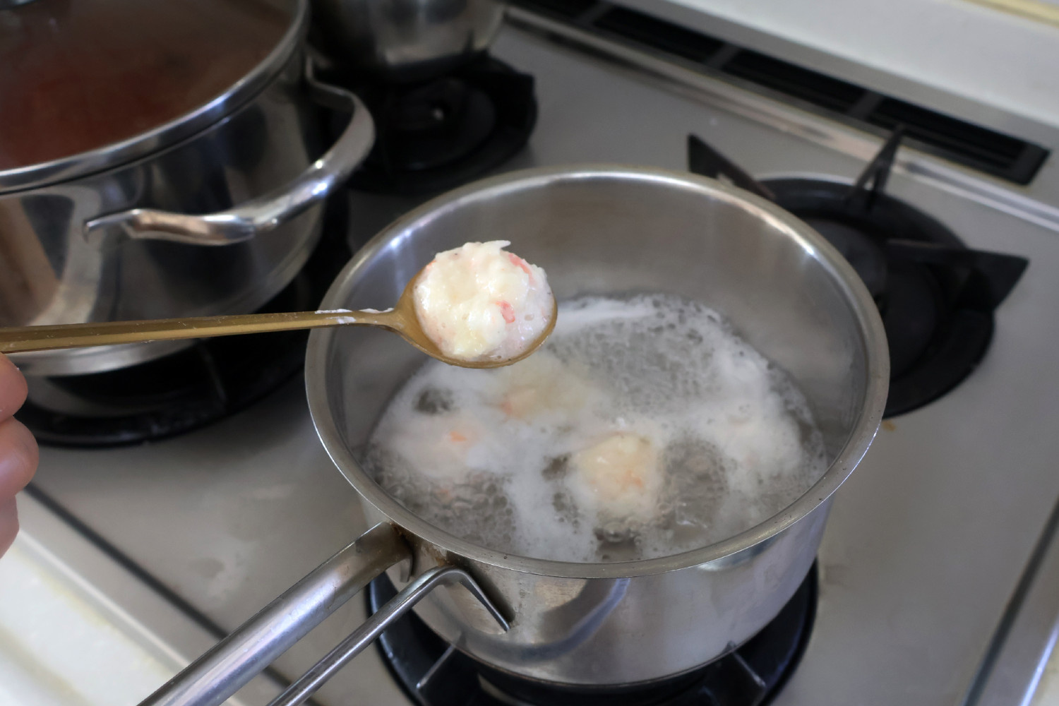 완자는 동그랗게 빚기 보다는 이렇게 끓는물에 수저로
