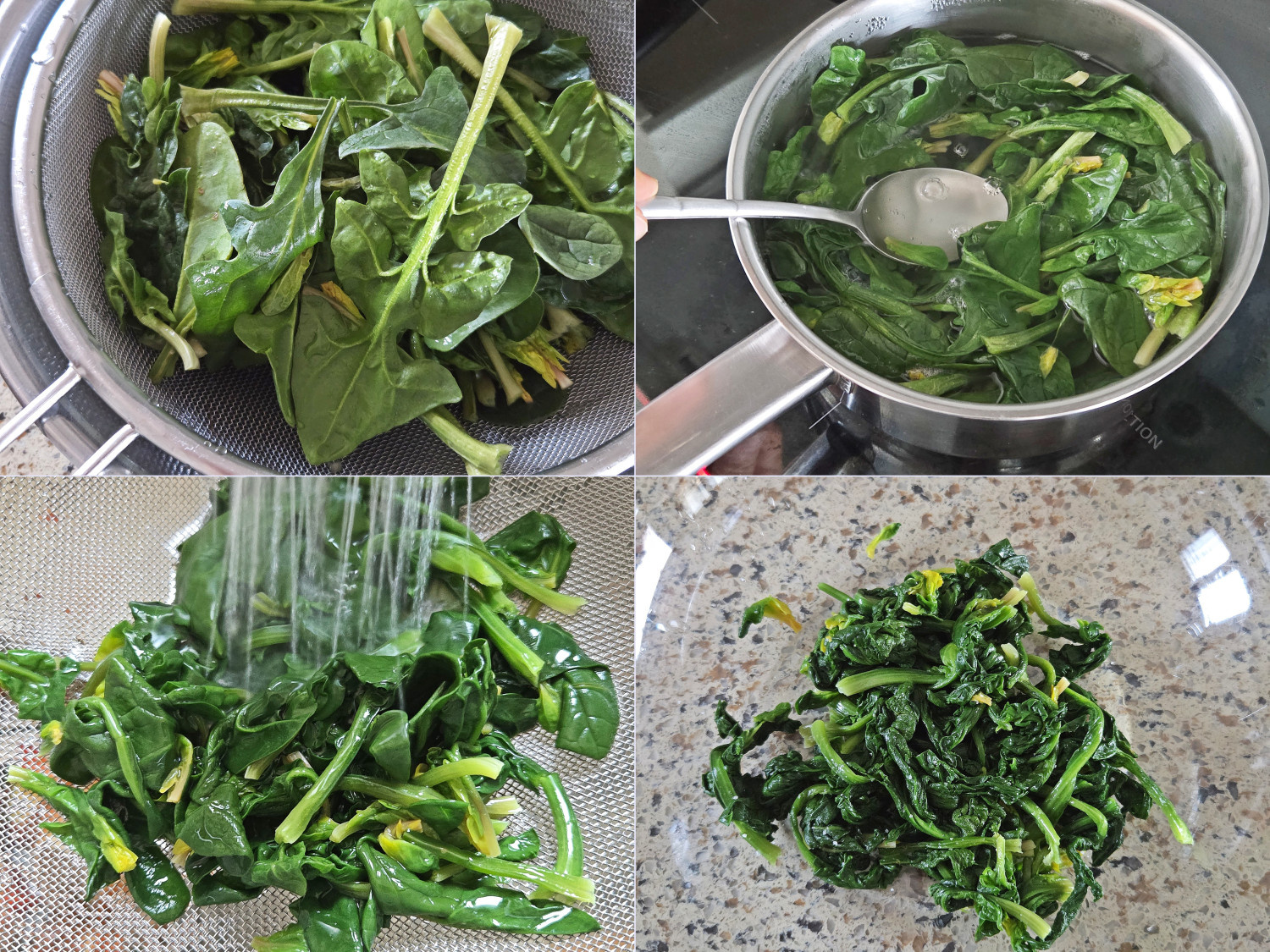 시금치는 밑동을 제거한 후 짓눌리거나 누렇게 뜬 잎을 제거한 뒤 흐르는 물에 깨끗이 헹구고,