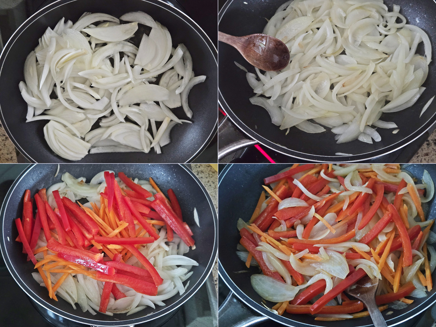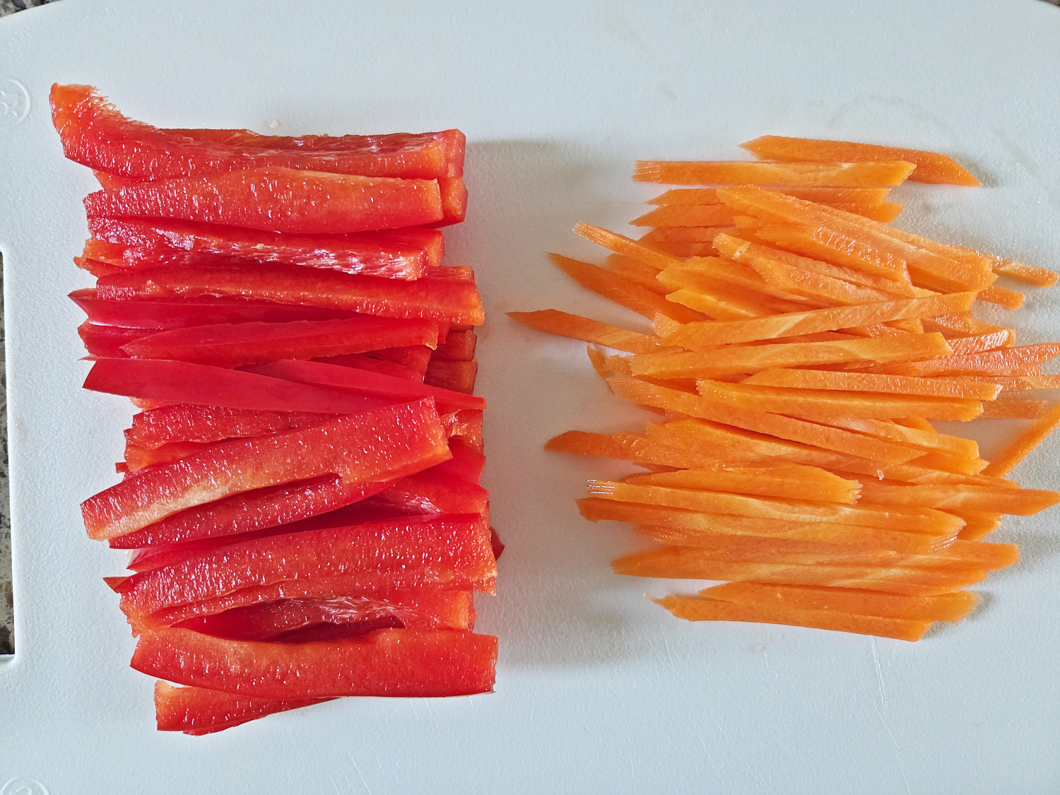 당근과 파프리카, 양파는 적당한 두께로 채썰어줍니다.
