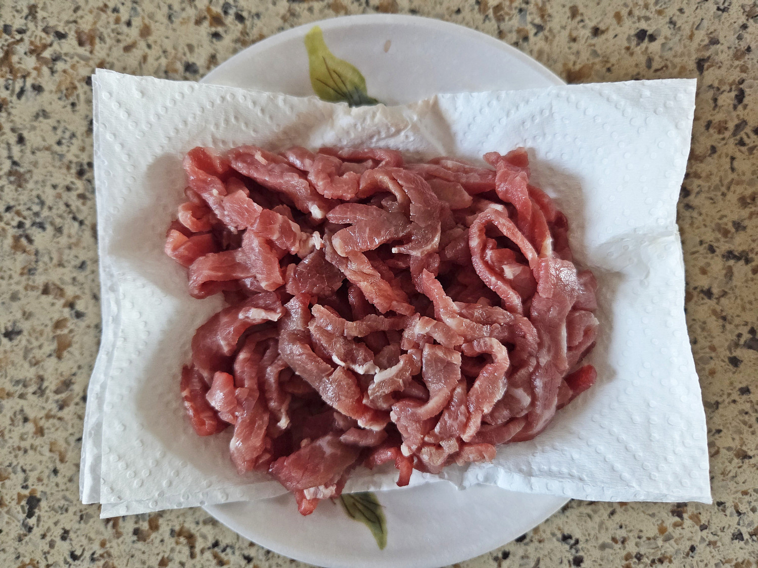 잡채용 소고기는 키친타월에 올려 핏물을 살짝 빼주고요.