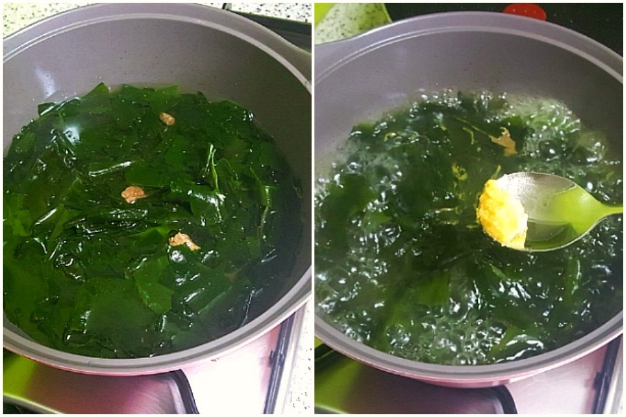 미역 불린 물 400m 를 붓고 강불로 푹 끓여줍니다. 국물이 끓기 시작하면 물 1L를 넣어주세요. 처음부터 물을 많이 넣기보다 이렇게 2번 나누어 푹 끓이면 국물맛이 더 진해집니다. 다진마늘, 국간장, 소금으로 간을 합니다. 기호에 따라 후추 약간 넣어주셔도 됩니다. 미역국 뜨기 직전 참기름 약간 넣어주면 훨씬 고소해집니다.