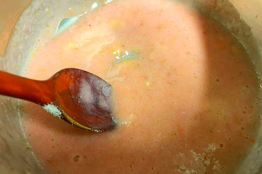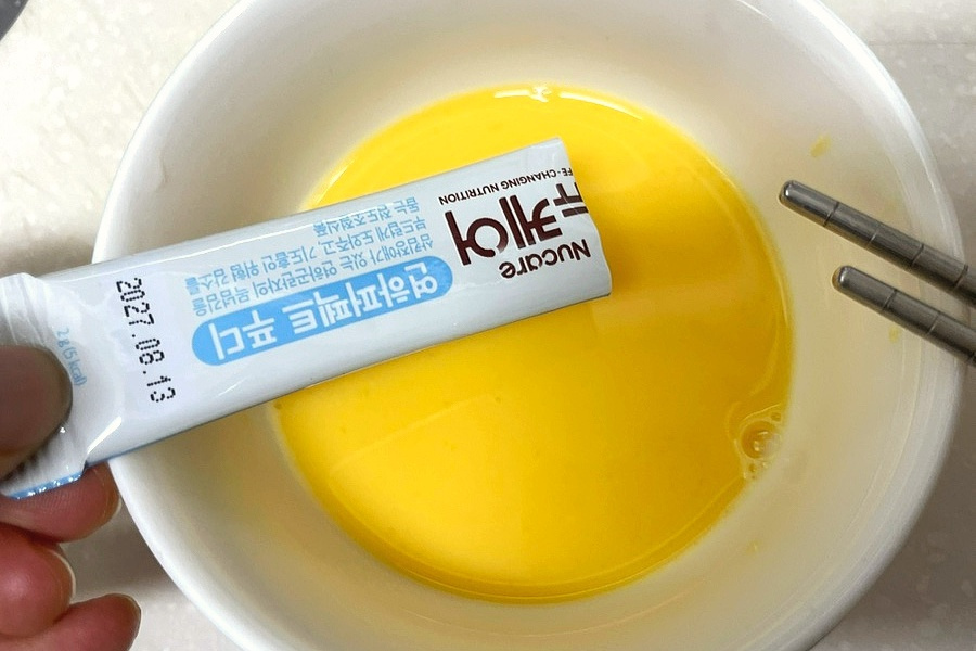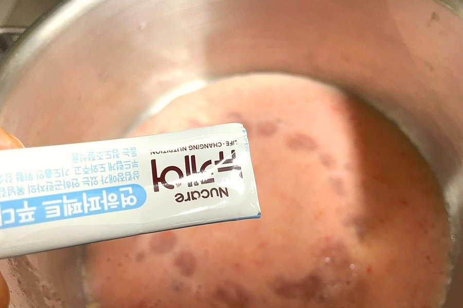 냄비에 연하퍼펙트 푸디 한포 넣고 식감이 푸딩처럼 되게 저어줍니다. 농도가 너무 무르면 1포 더 넣어줍니다.