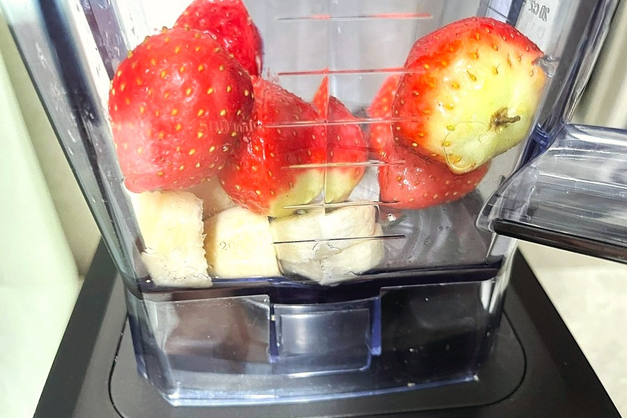 딸기와 바나나를 종이컵 기준 1:1로 믹서기에 갈아줍니다.