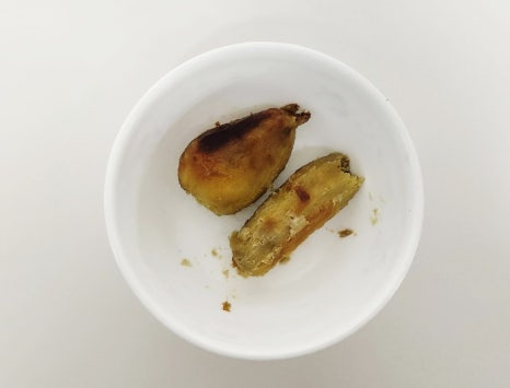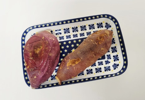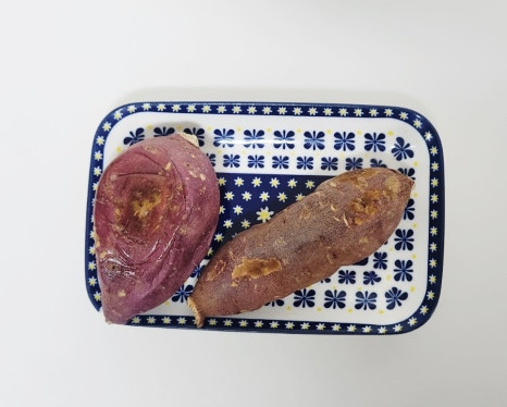 저는 집에 구워놓은 고구마가 있어서 준비했는데요. 생고구마라면 본인 기호에 맞게 굽거나 삶아서 준비해 주세요. 저는 에어프라이어에서 180도로 40분간 구운 고구마를 사용했어요. 고구마가 식어서 1분 정도 전자레인지에 데워주었어요!